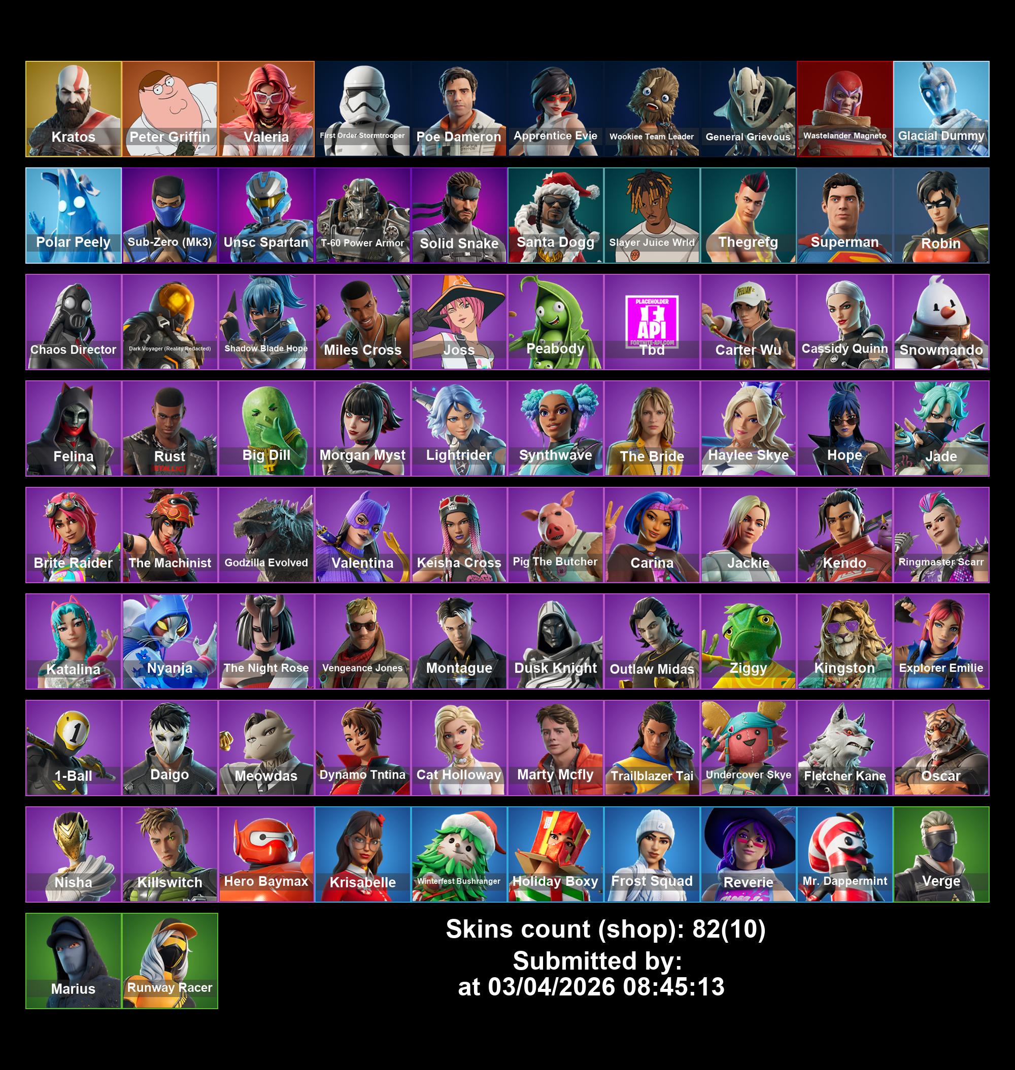 #SM4476 [PC/PSN/XBOX] 82 skins | Kratos | Peter Griffin | Valeria | First Order Stormtrooper | Poe Dameron | Apprentice Evie | Wookiee Team Leader | General Grievous