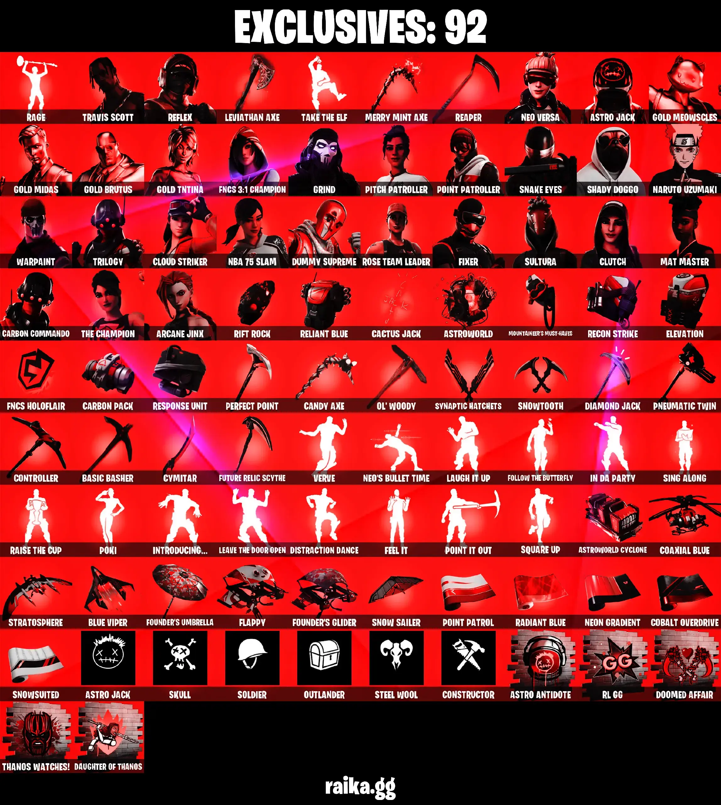 🎁🎄STACKED EXCLUSIVE BUNDLE🎄🎁 542 SKINS 🌙 TRAVIS SCOTT 🌙 MERRY MINT AXE 🌙 LEVIATHAN AXE 🌙 CHUN LI 🌙 OG STW 🌙 GHOUL TROOPER 🌙 JOHN WICK 🌙 RAGE 🌙 TRAVIS SCOTT 🌙 REFLEX 🌙 AGENT PEELY 🌙 SKULL TROOPER 🌙 REAPER ⚡️PC/XBOX/SWITCH⚡️ PARENT CONTROL #ITM0029