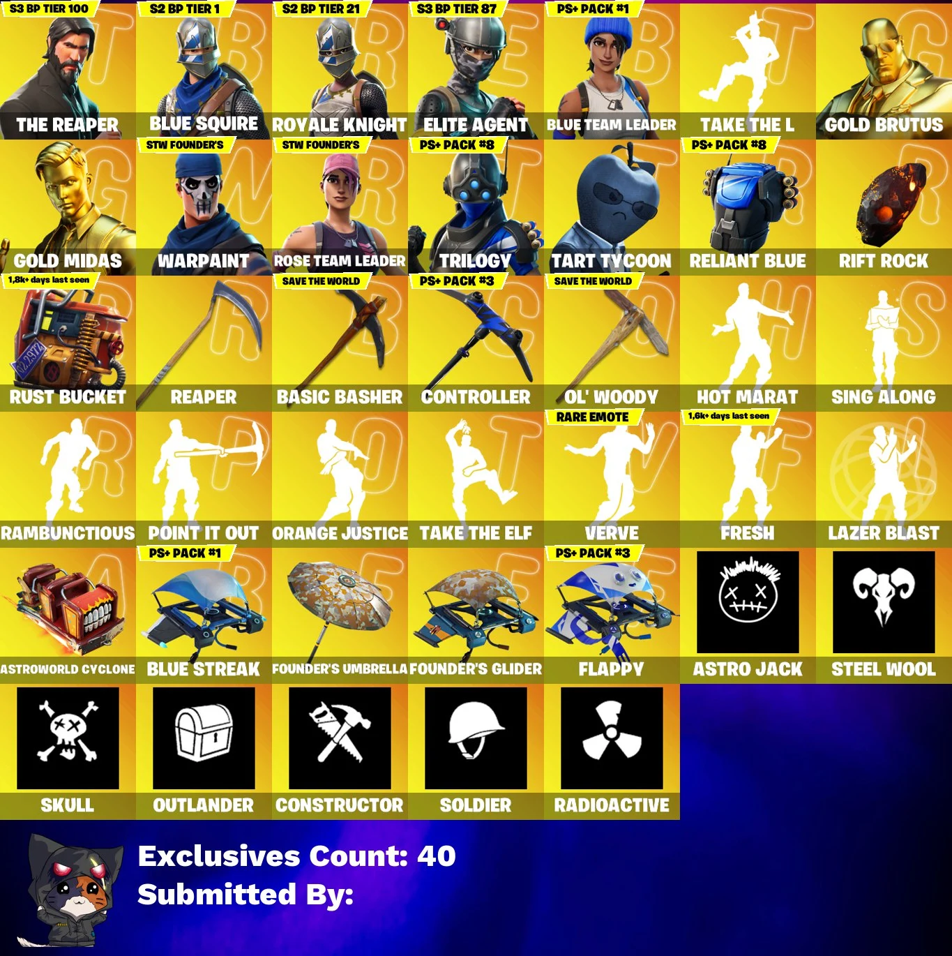ππ₯ STACKED OG ACCOUNT π₯π 106 SKINS π THE REAPER π BLUE SQUIRE π ROYALE KNIGHT π ELITE AGENT π TAKE THE L π GOLD BRUTUS π GOLD MIDAS π TRILOGY π TART TYCOON π CARBIDE π ENFORCER π DARK VOYAGER π VALERIA π VALOR π 300 VB π OG STW π FULL ACCESS π