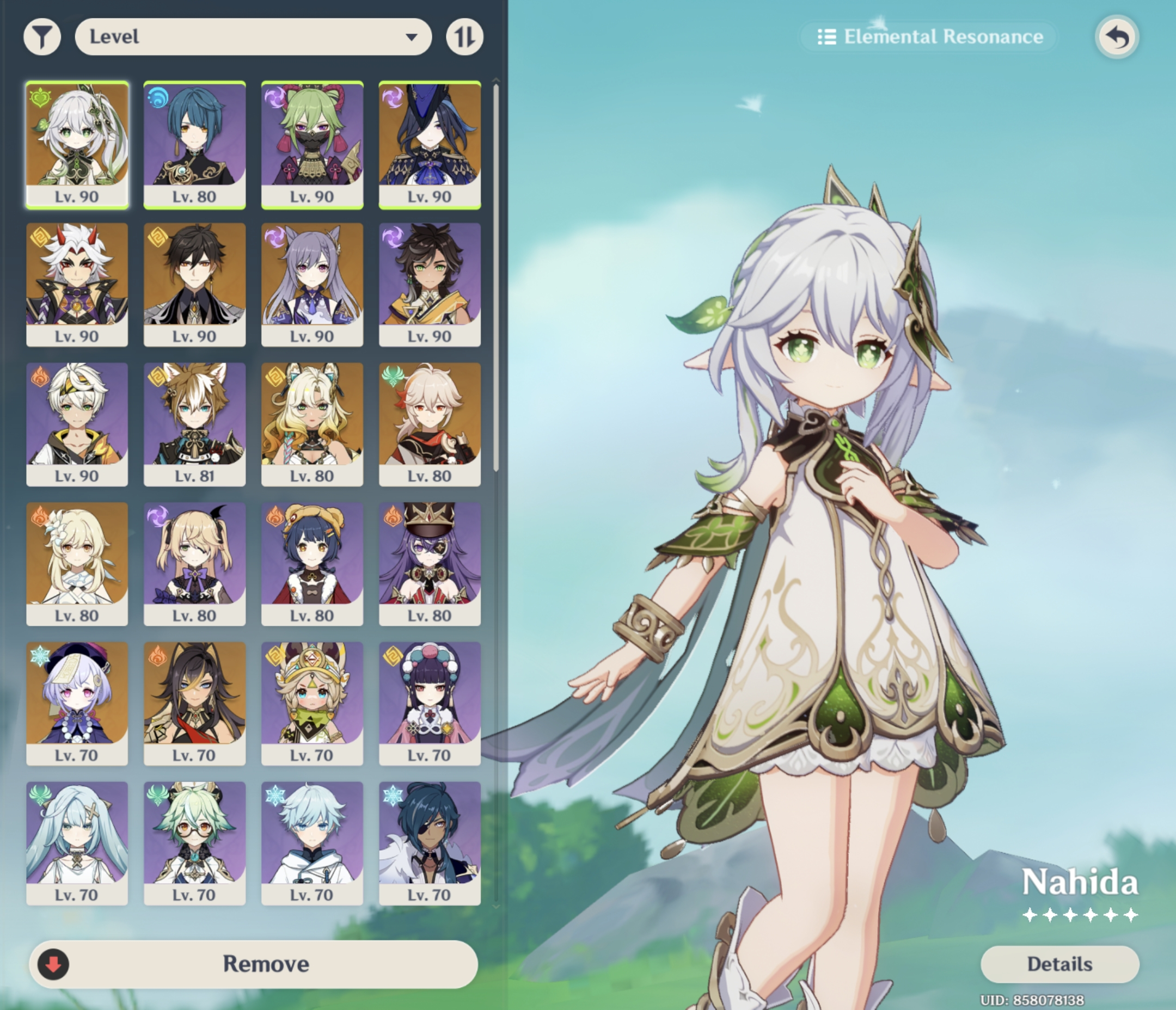 Nahida Clorinde Itto c6r1 , Zhongli Xilonen kazuha