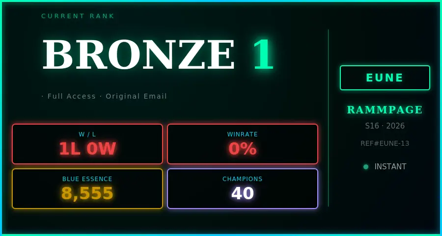 EUNE ⚡ Bronze I (P) Ranked Ready 💎 8.6K+ BE (1L 0W) In Placement ✅ Full Access ✅ Instant Delivery 🕐