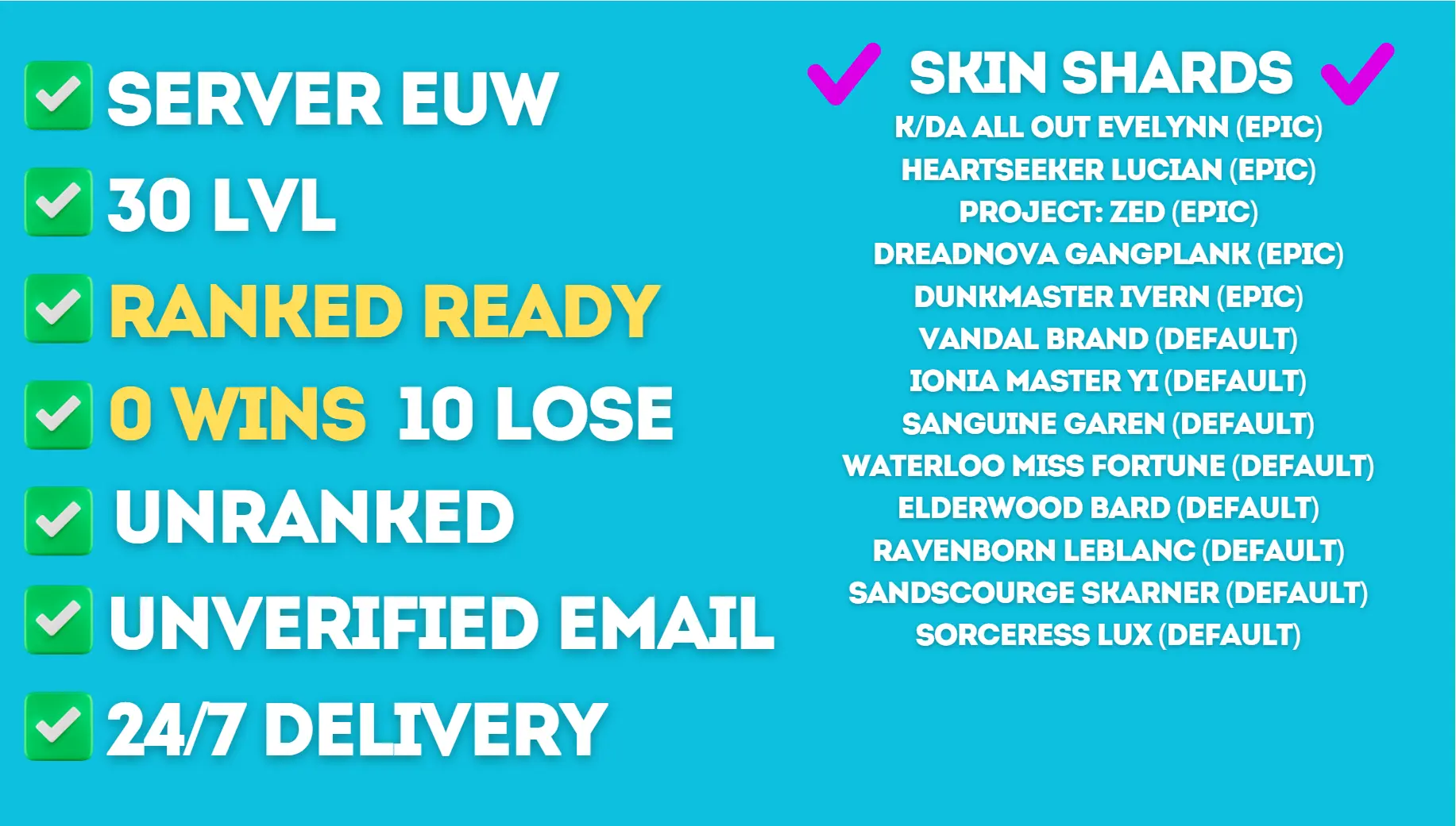 EUW 30 LvL ✅ Ranked Ready ✅ BE: 57175 ✅ Unverified ✅ Unranked ✅ Shards: K/DA ALL OUT Evelynn, Heartseeker Lucian, PROJECT: Zed, Dreadnova Gangplank, Dunkmaster Ivern, Vandal Brand, Ionia Master Yi, Sanguine Garen, Waterloo Miss Fortune, Elderwood Bard