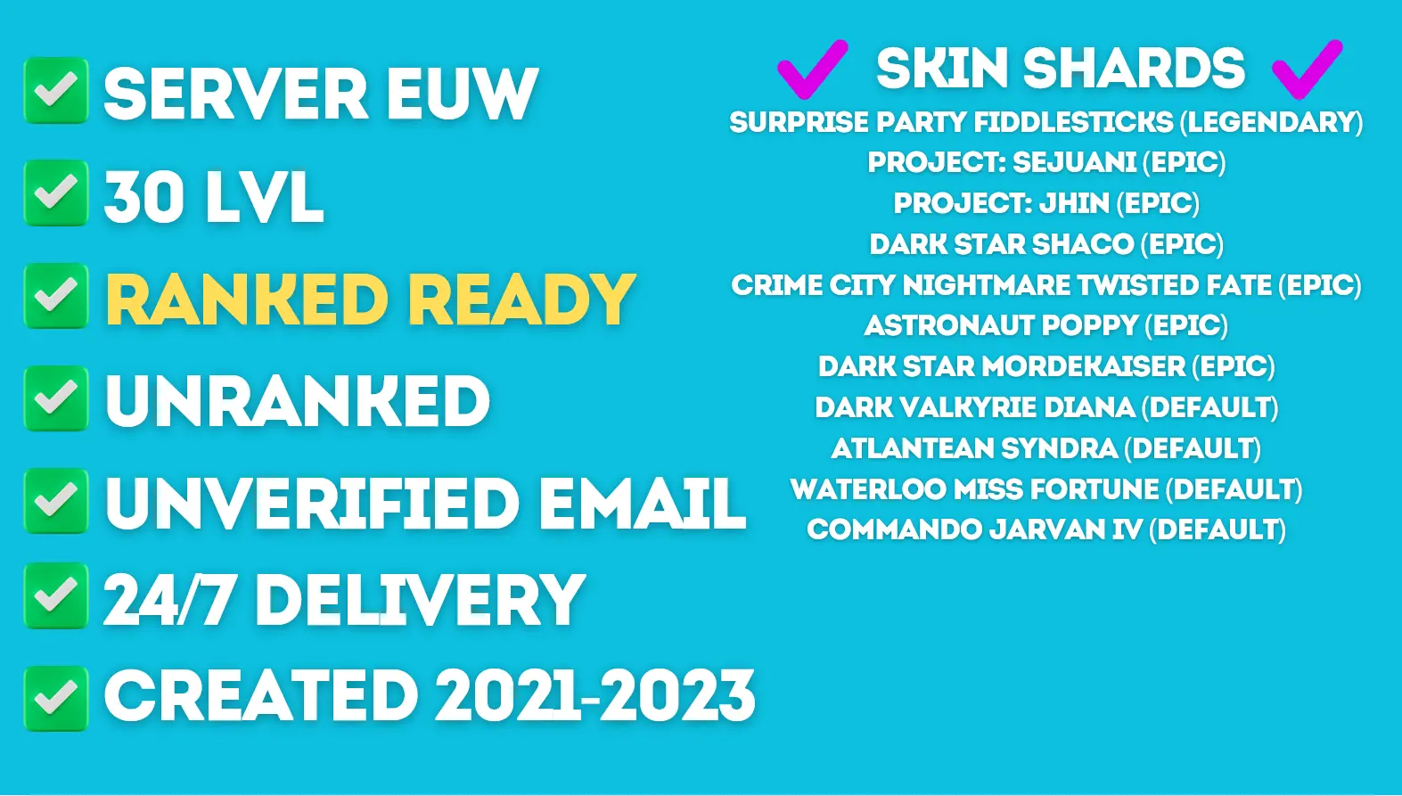 EUW 30 LvL ✅ Ranked Ready ✅ BE: 61325 ✅ Unverified ✅ Unranked ✅ Shards: Surprise Party Fiddlesticks, PROJECT: Sejuani, PROJECT: Jhin, Dark Star Shaco, Crime City Nightmare Twisted Fate, Astronaut Poppy, Dark Star Mordekaiser, Dark Valkyrie Diana