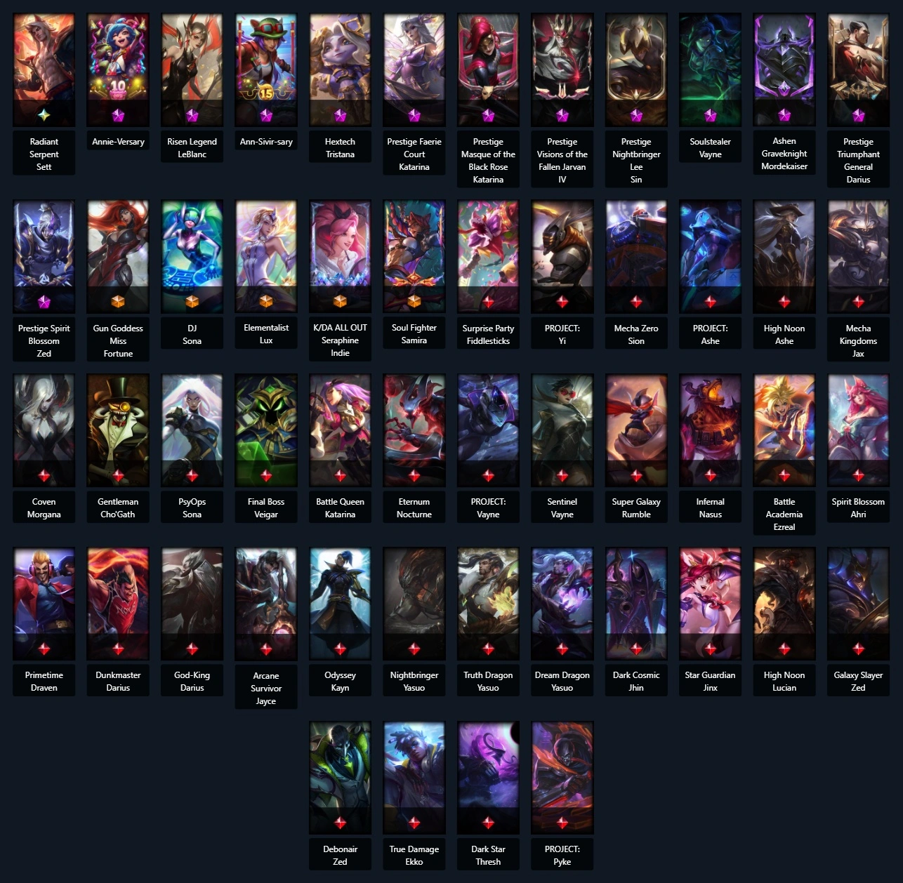 UnRanked┃427 skins┃171 Champs┃(12 Mythic) Radiant Serpent Sett Arcane Survivor Jayce Soulstealer Vayne Ashen Graveknight Mordekaiser Prestige Spirit Blossom Zed Prestige Nightbringer Lee Sin Hextech Tristana
