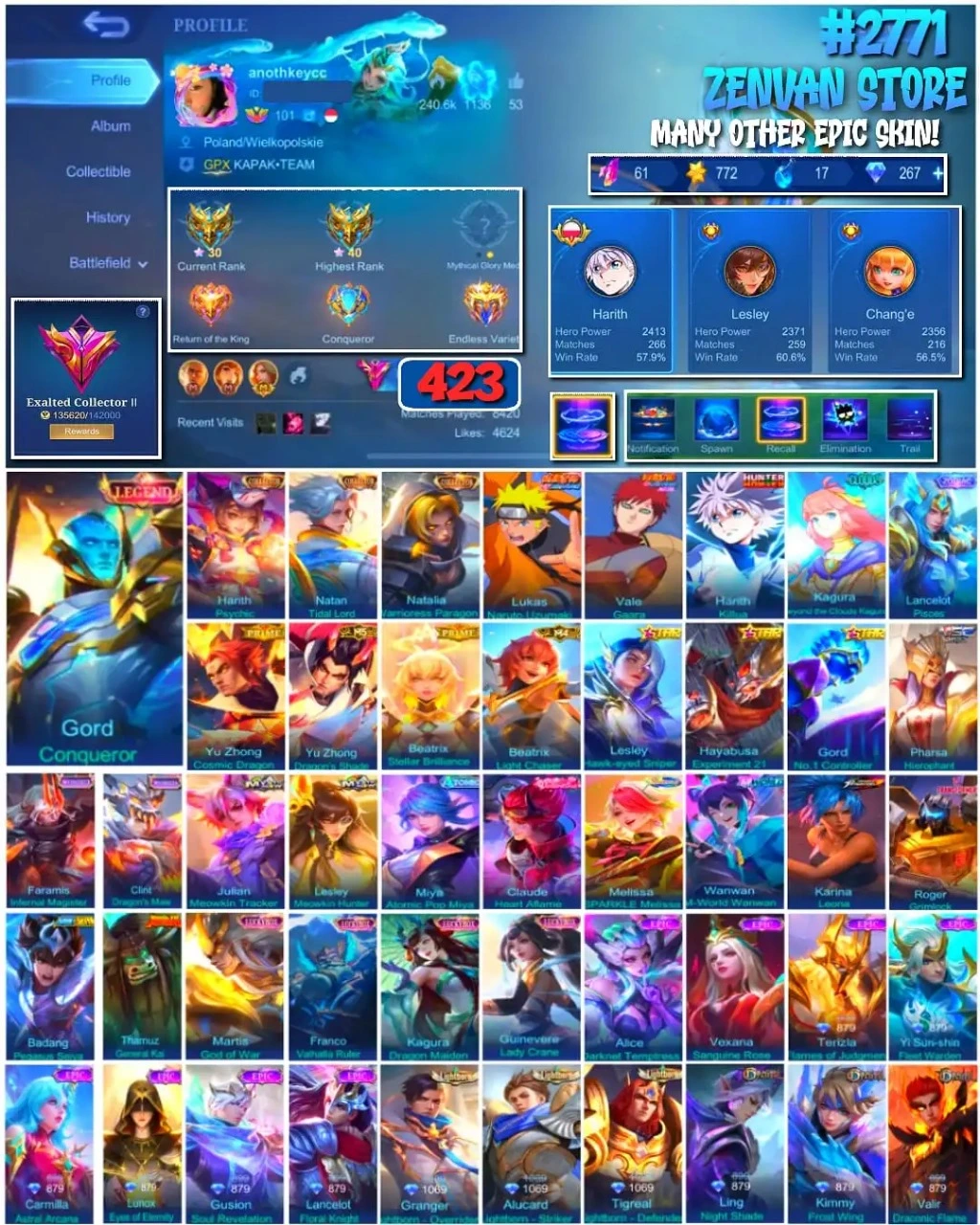 #2771 🔥 423 Skins 🔥 Legend Gord 🔥 Collector Harith, Natan & Natalia 🔥 Naruto 🔥 HunterXHunter Killua 🔥 Clouds Kagura 🔥 Prime Beatrix & Yu Zhong 🔥 M-World Wanwan 🔥 Transformers Roger 🔥 Many Limited 🔥 Many Epic 🔥 Safe Account ✅