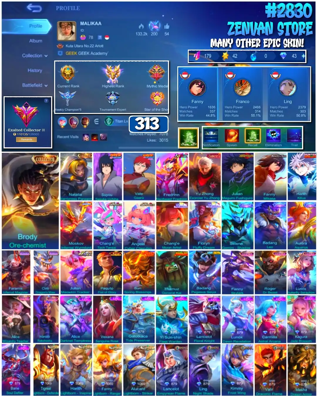 #2830 🔥 313 Skins 🔥 Collector Natalia, Brody 🔥 Sasuke, Neobeast Fredrinn 🔥 Jujutsu Kaisen Megumi 🔥 Attack on Titan Mikasa 🔥 Many Limited 🔥 Many Zodiak 🔥 Many Epic 🔥 Safe Account ✅