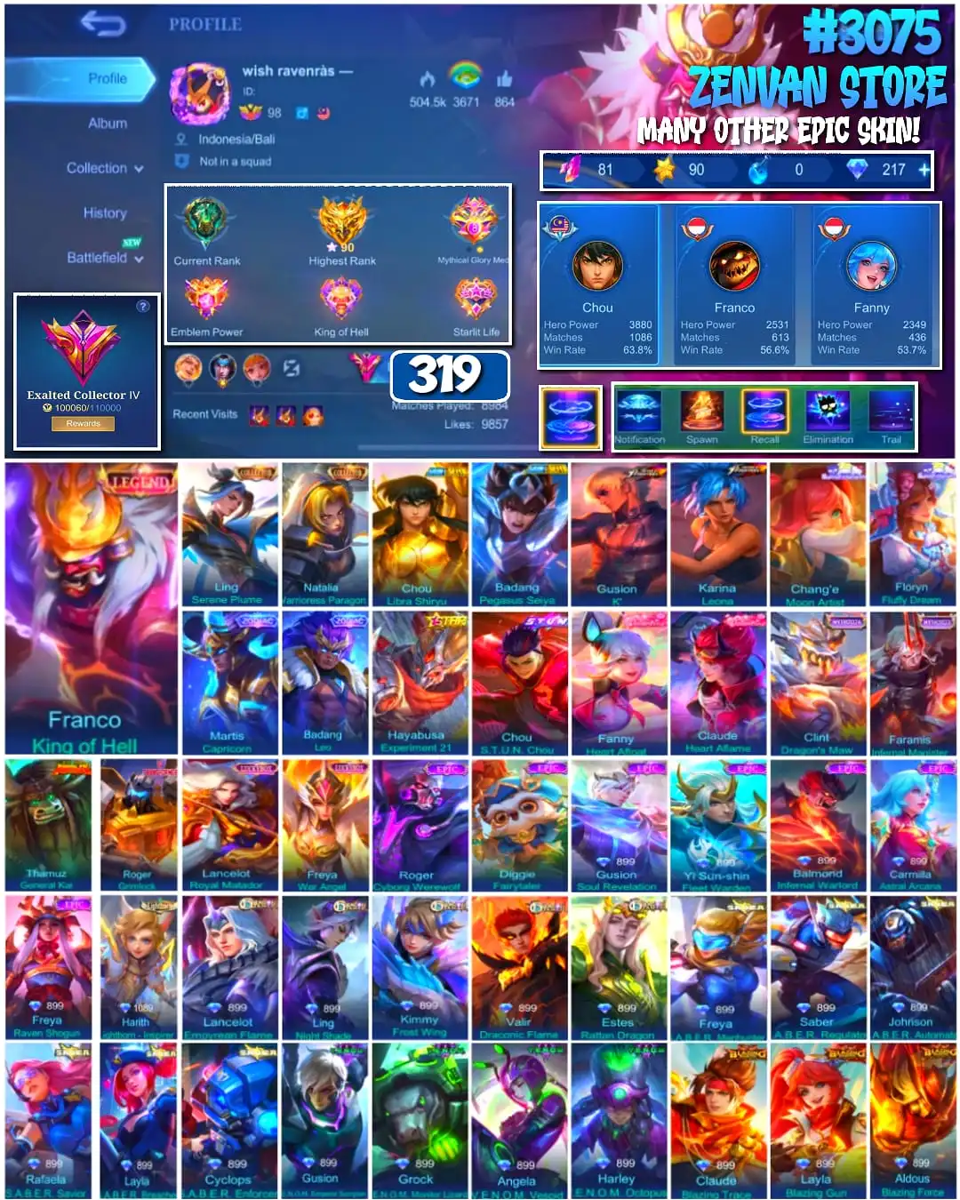 #3075 🔥 319 Skins 🔥 Legend Franco 🔥 Collector Ling, Natalia 🔥 Seint Seiya Chou & Badang 🔥 Sanrio Change, Floryn 🔥 KoF Gusion, Karina 🔥 Many Epic 🔥 Safe Account ✅