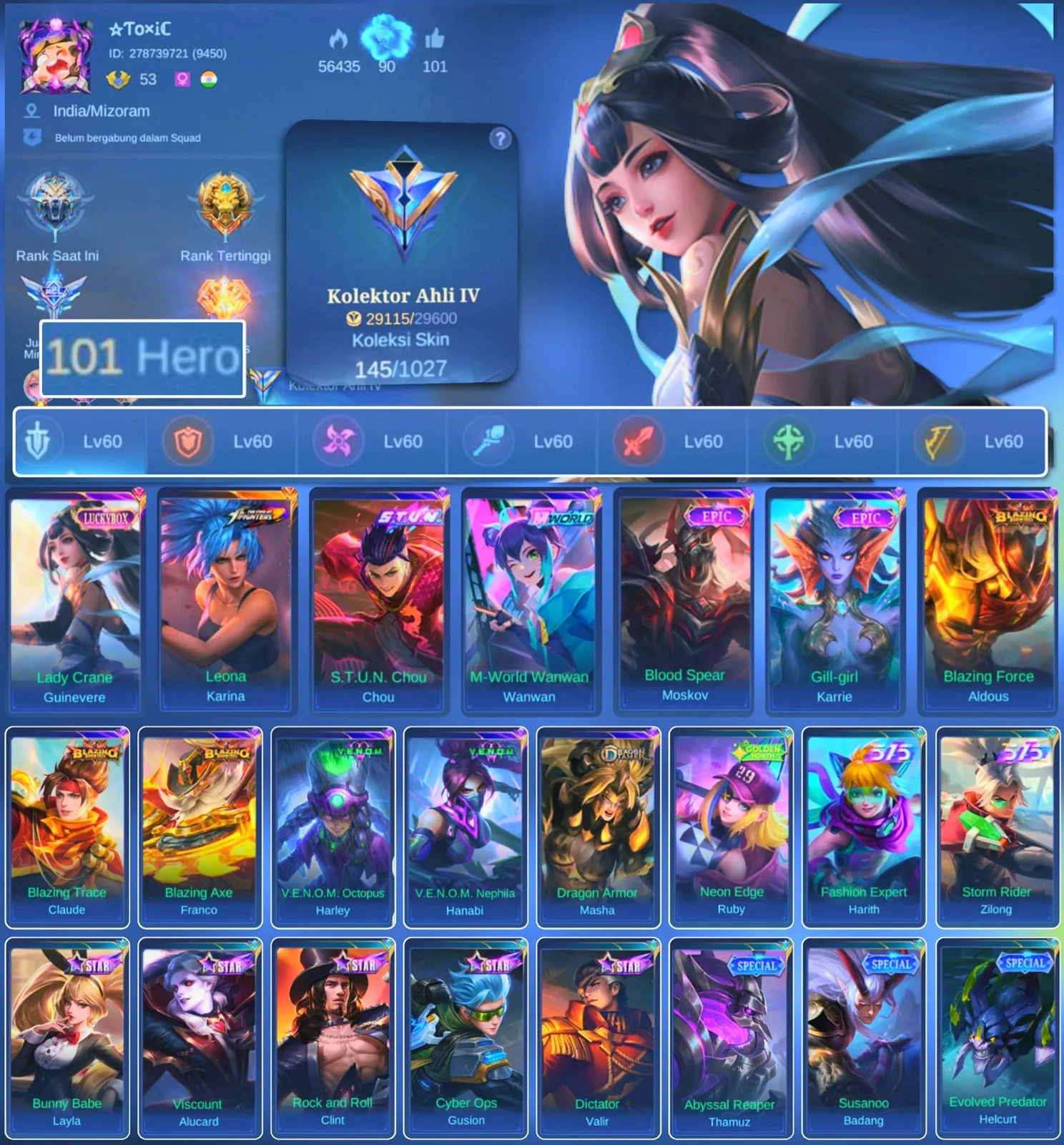 HERO 101 SKIN 145 | EMBLEM ALL MAX | KOF KARINA | STUN CHOU | EPIC KARIE | HERO GOOD | SKIN GOOD | INSTAN DELIVERY