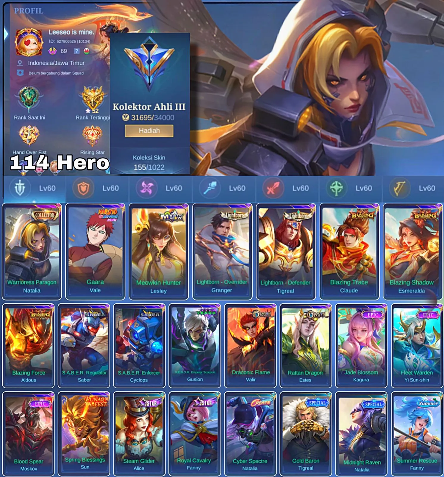 HERO 114 SKIN 155 | EMBLEM ALL MAX | COLECTOR NATALIA | VALE GARA | EPIC YSS | HERO GOOD | SKIN GOOD | INSTAN DELIVERY