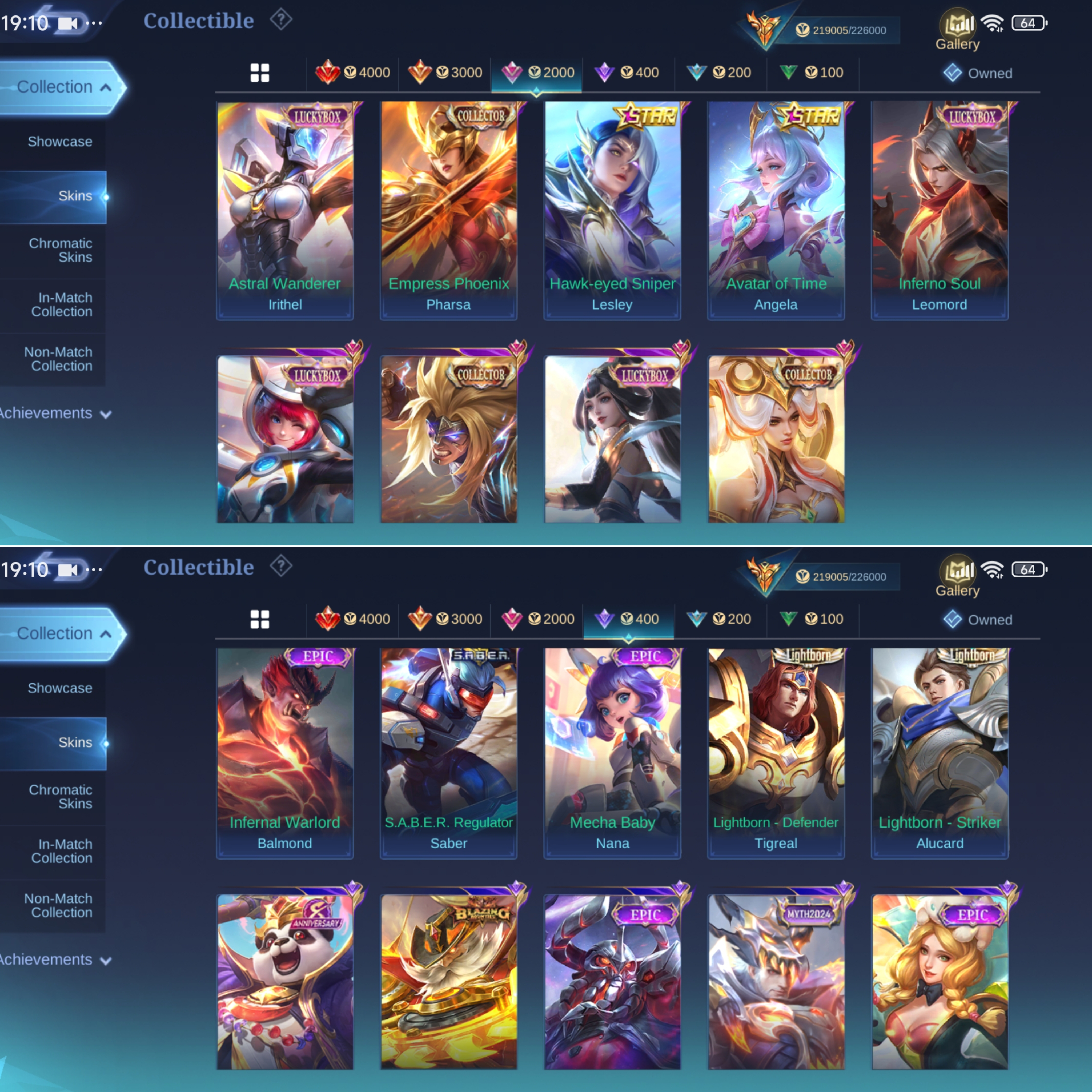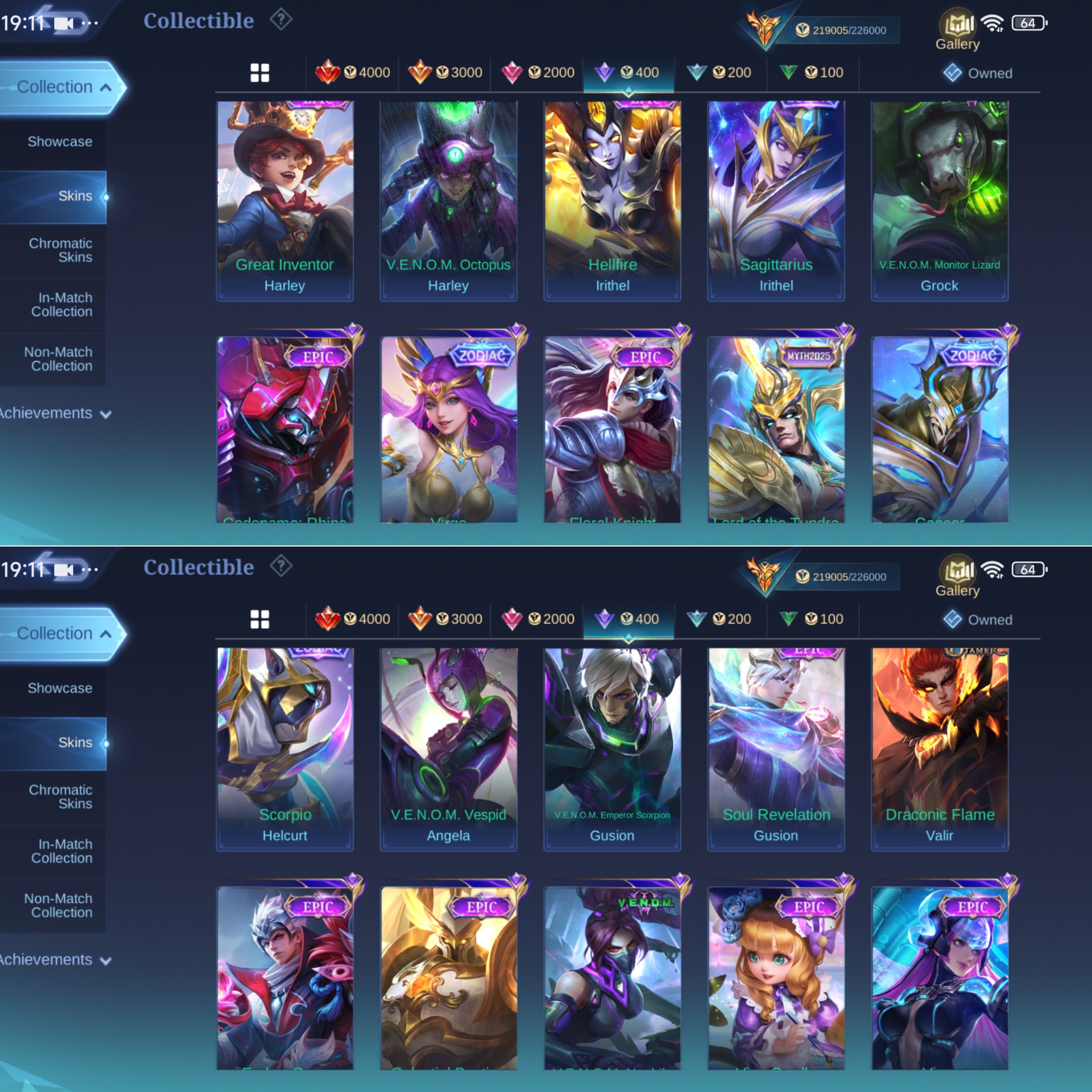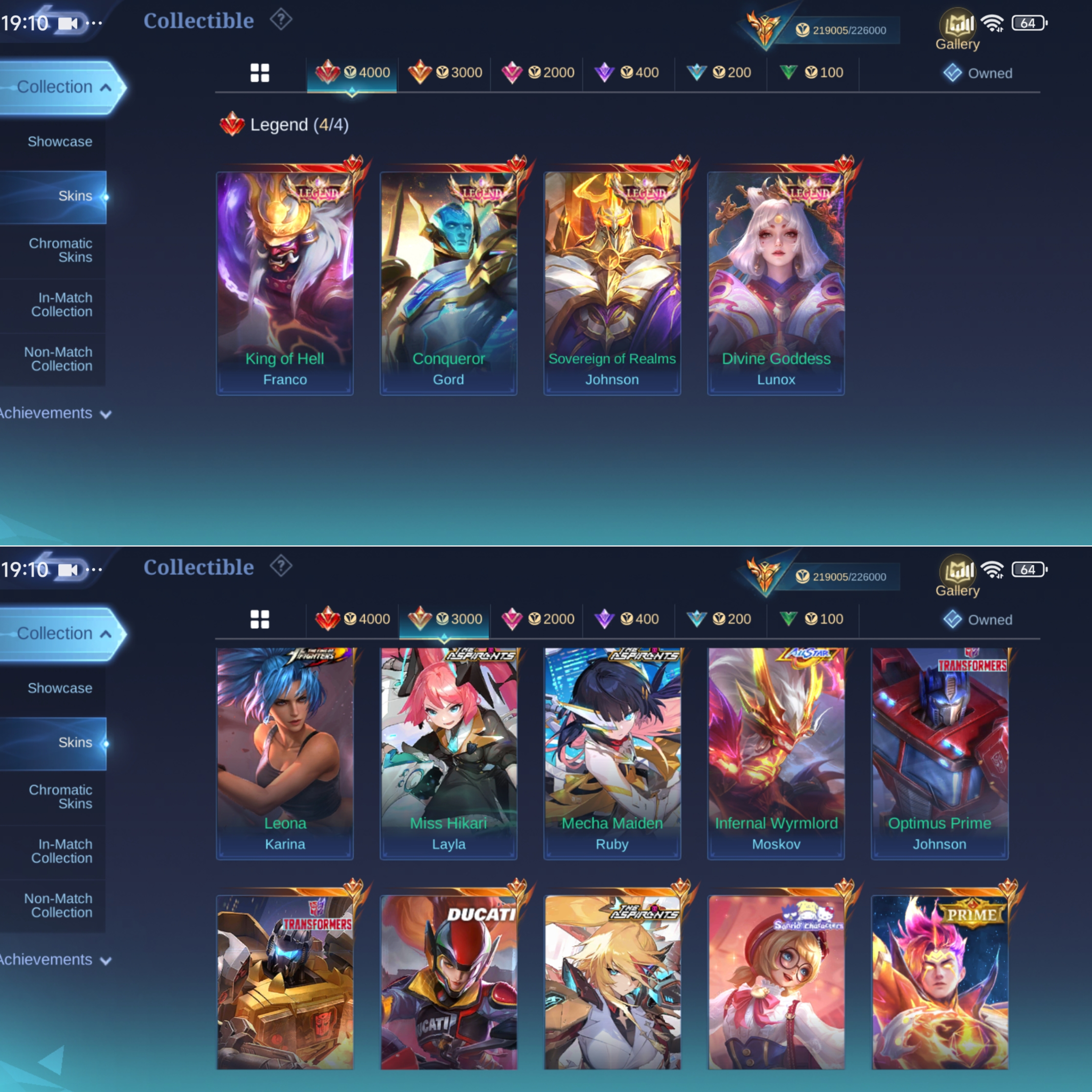 ML-817 Skins 538 [ 4 Legend ] Ex Immortal 133 / 4 Aspirants / Allstar Moskov / Ducati Irithel x Benedetta / Neobeast Lylia / Collector YSS x Pharsa