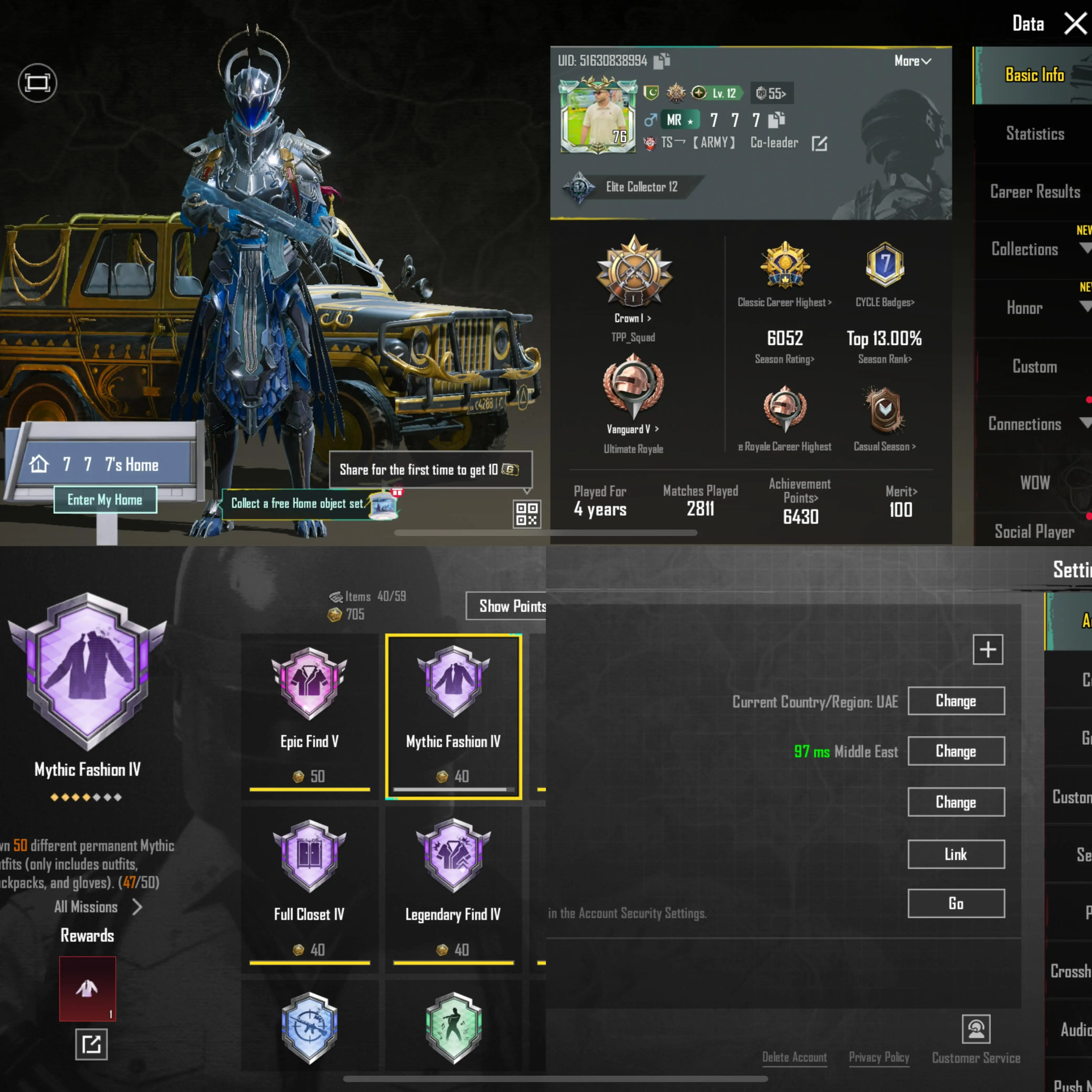 LVL 76 🏮 47 Mythics 🏮 Poseidon Xsuit L1 🏮 11x Gun Labs 🏮 UMP Anniv Max 🏮 AKM Glacier L4 🏮 OP SCAR-L L4 🏮 Kar98K L3 🏮 4x Material 🏮 P202