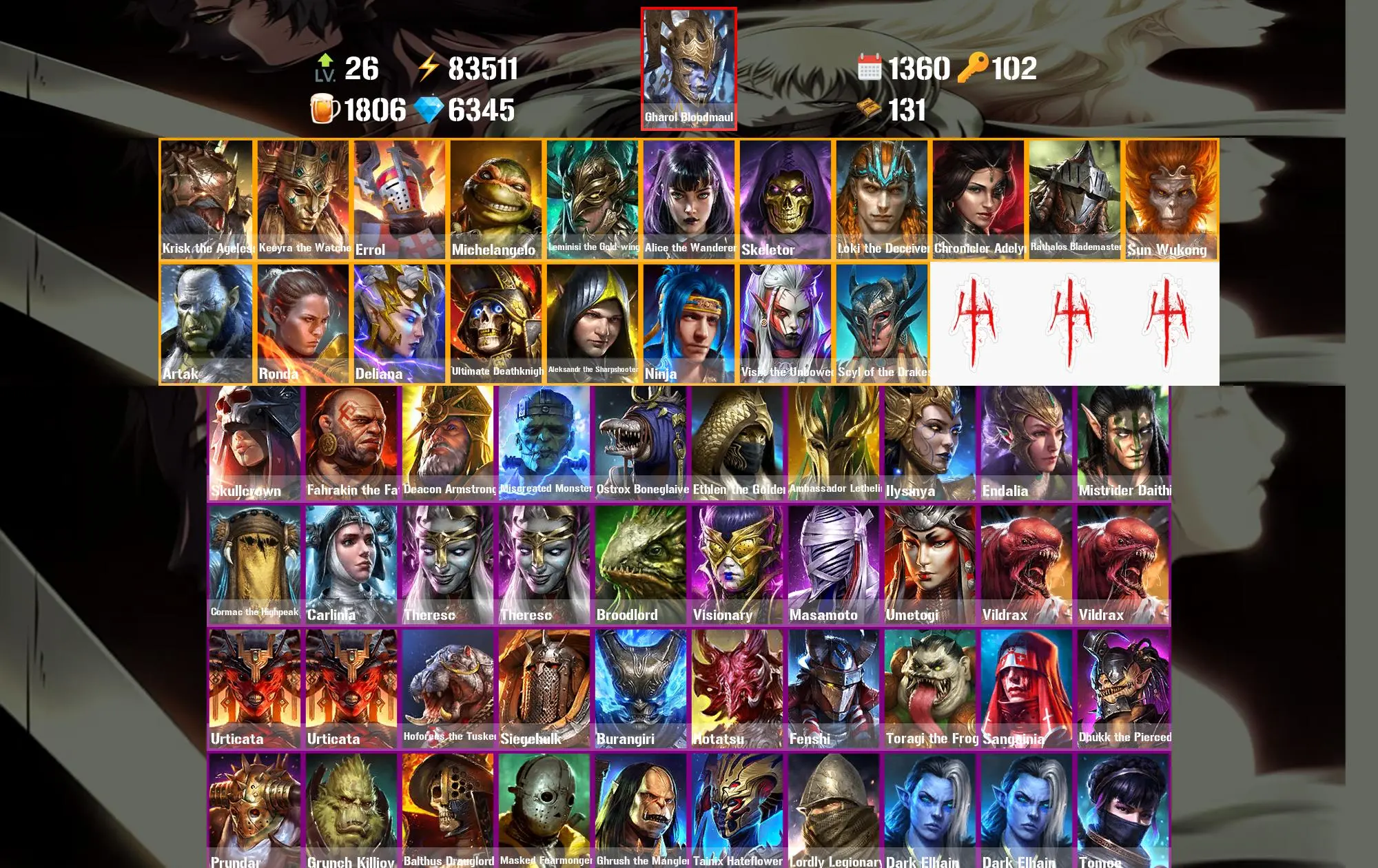 1360 Days 83.5k Energy [Mythical Starter] Gharol Bloodmaul ⸱ Krisk the Ageless ⸱ Keeyra the Watcher ⸱ Errol ⸱ Michelangelo ⸱ Leminisi the Gold-wing ⸱ Skullcrown ⸱ Fahrakin the Fat ⸱ 55.6m Silver ⸱ 6.3k Gems