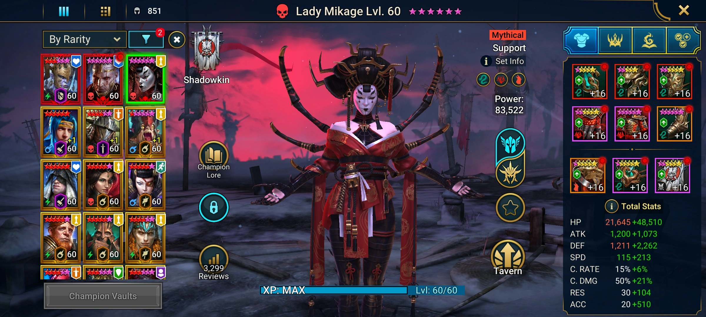 [3 Mythical Champions][10.63M] Lady Mikage,Gharol,Embrys + 149 LEGENDARY (Marius,Arb 394,Sulfuryion,Nekhret,Leo,Lamasu,Ninja+1(6*),Fabian,Gnut(5*),Raph,Vizug,R.N.Archer,Kimi(5*)/x2,Trunda,Pythion x2,Candr,Teodor,Kaja,Gnishak...) + 1k UNM + 1k NM HYDRA