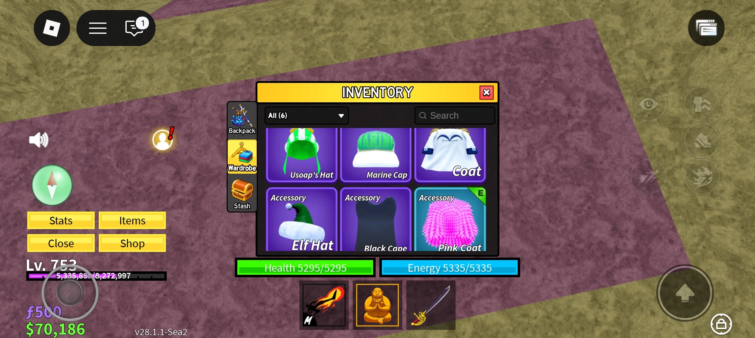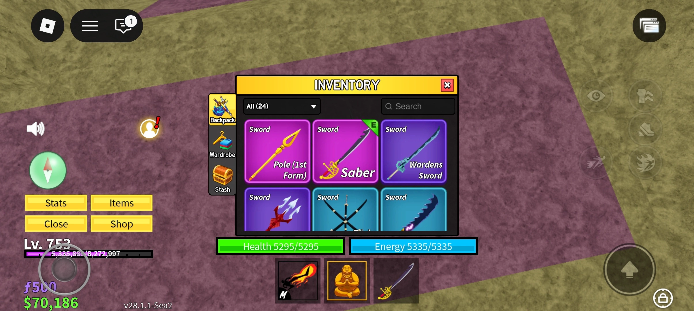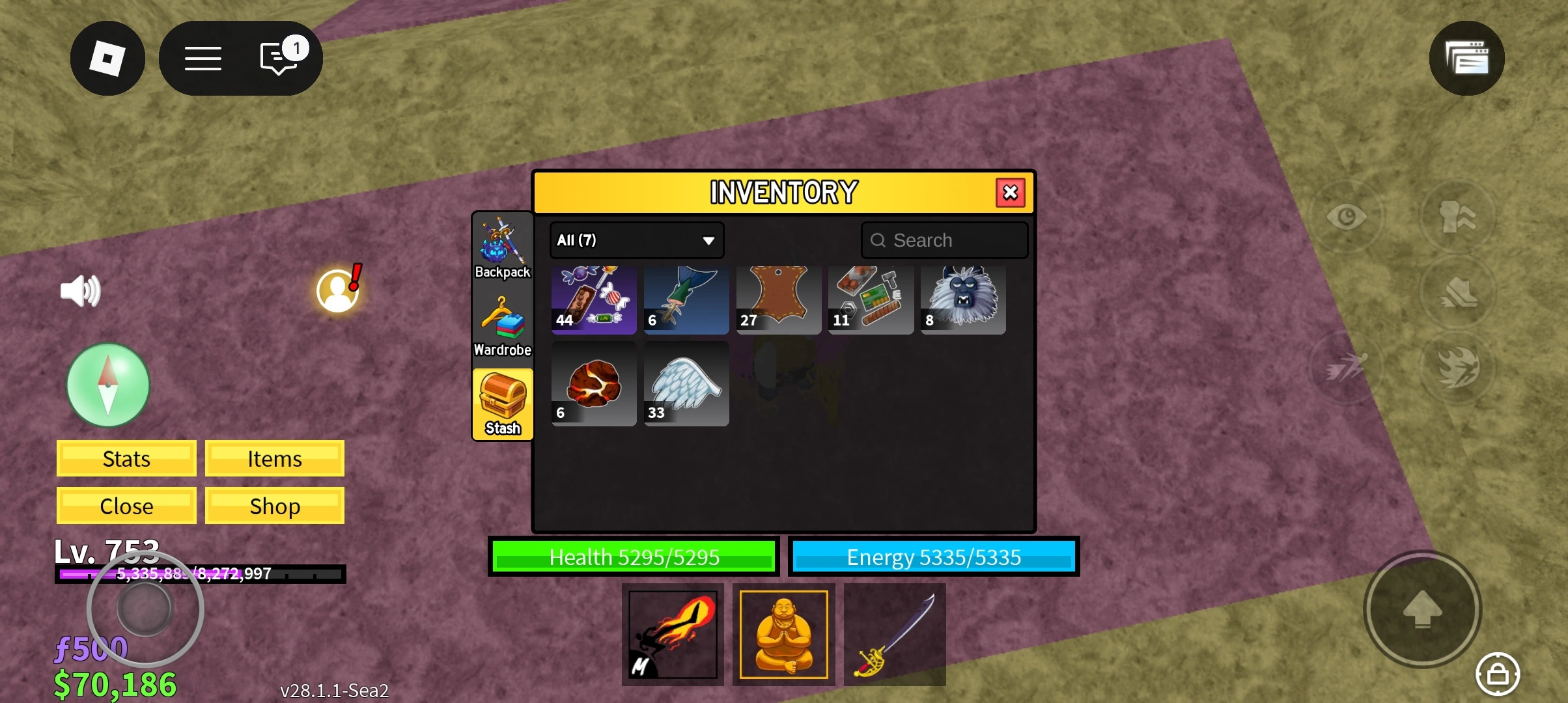 RA009/BLOX FRUIT/LEVEL 753/MUCH INVENTORY/8 SWORDS/16 TREASURE/6 WARDROBE/$70.168/f 500/MUCH MATERIALS