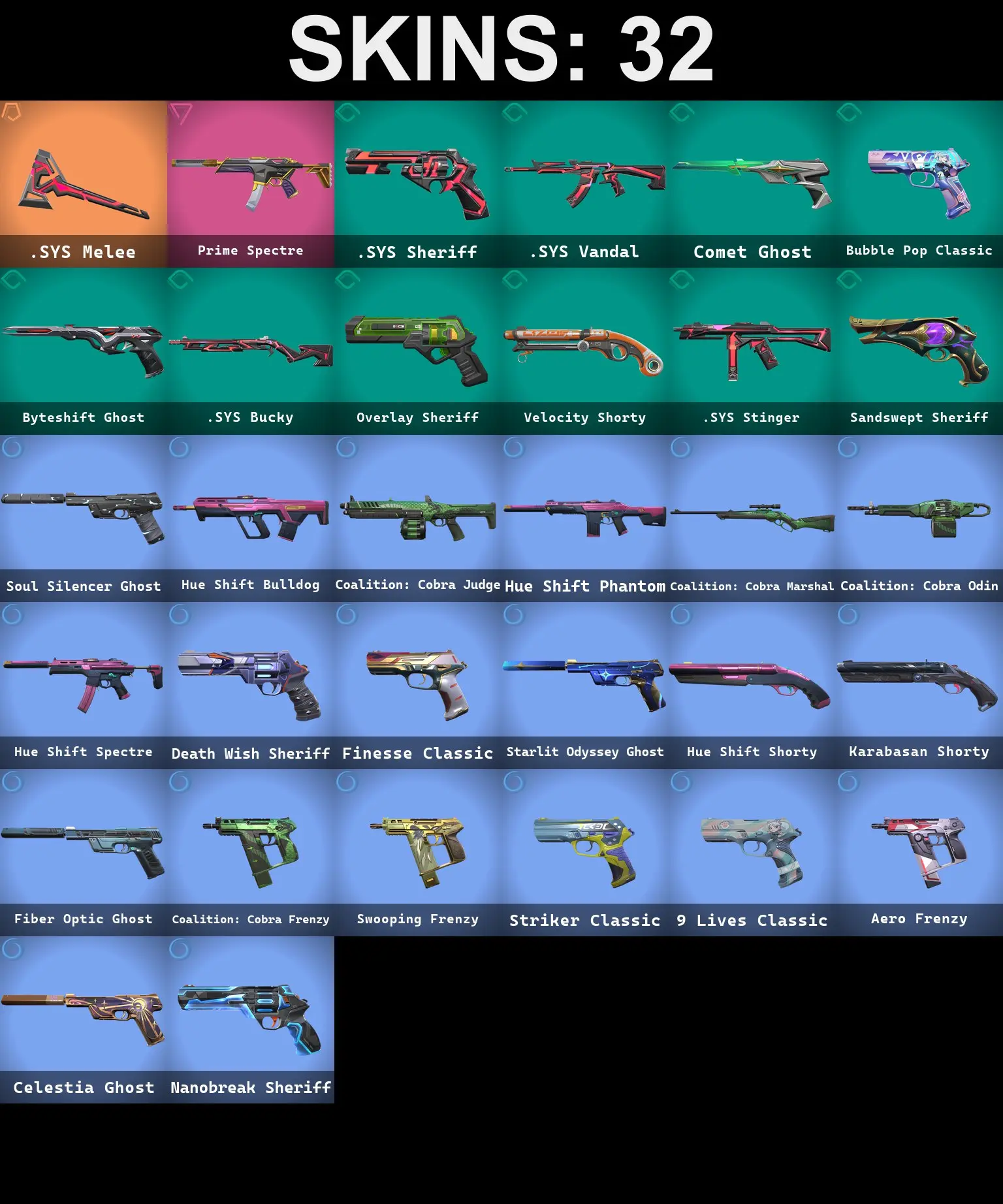 ❤️ 32 SKINS ❤️ 1 KNIFE ❤️ PRIME SPECTRE ❤️ COMET GHOST ❤️ .SYS MELEE ❤️ .SYS SHERIFF ❤️ .SYS VANDAL ❤️ BUBBLE POP CLASSIC ❤️ BYTESHIFT GHOST ❤️ .SYS BUCKY ❤️ OVERLAY SHERIFF ❤️ VELOCITY SHORTY ❤️ .SYS STINGER