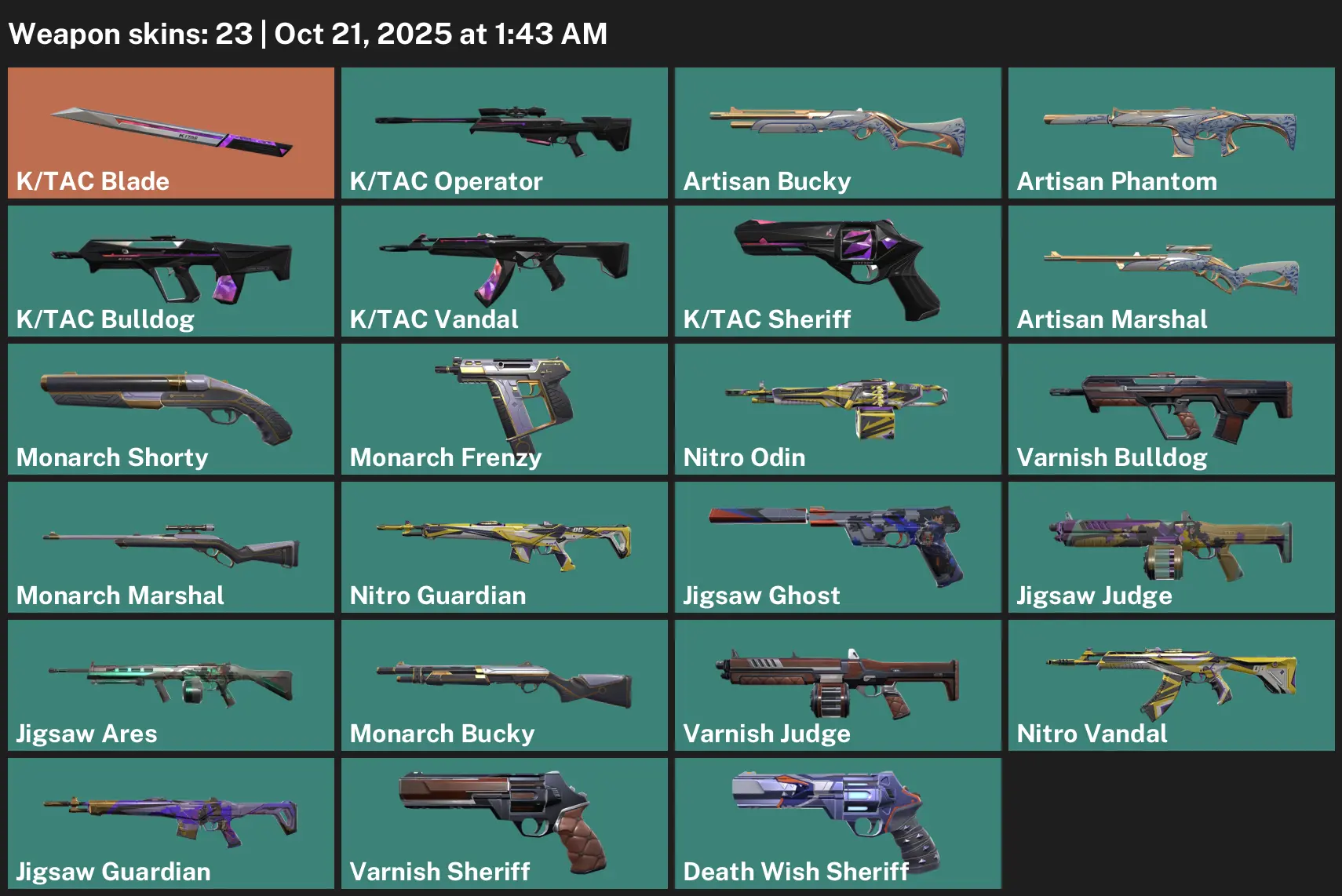 AP | 23 Skins | exp IRON 2 | K/TAC Blade | Nitro Vandal | K/TAC Vandal | Artisan Phantom | K/TAC Operator | Monarch Frenzy | Monarch Marshal | S4G