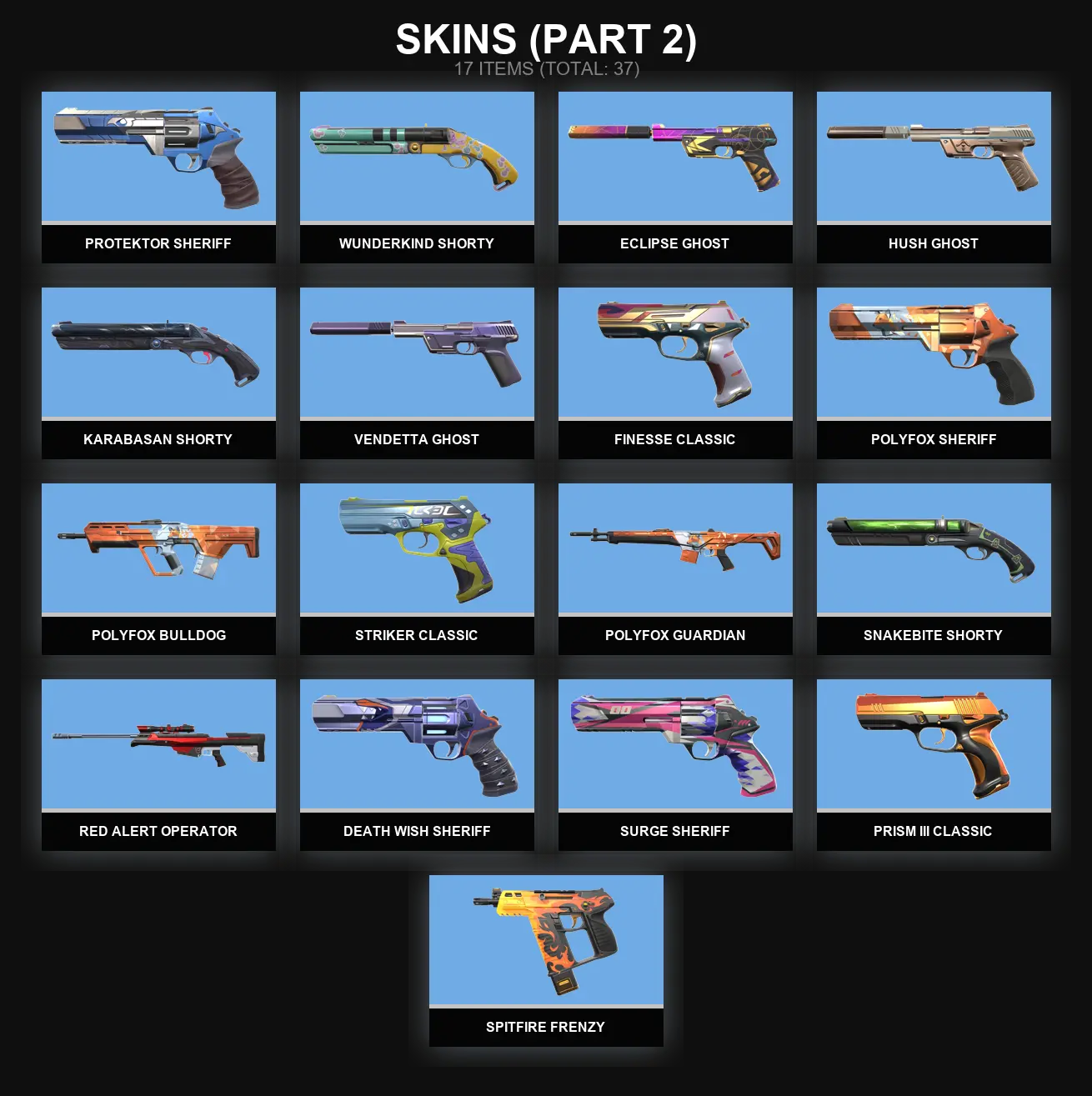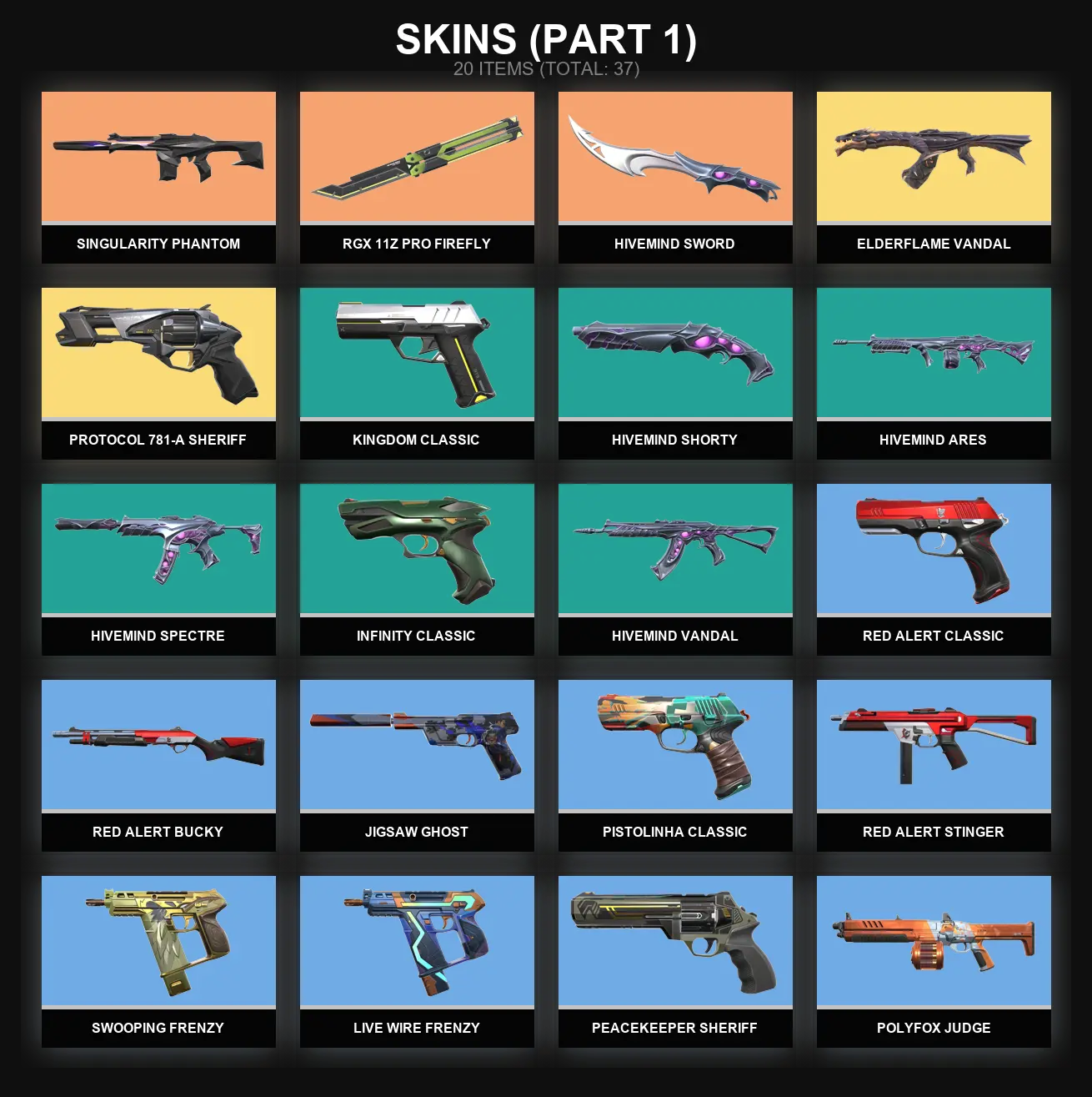 AP | 37 skins 🐓 RGX 11z Pro Firefly 🐓 Elderflame Vandal 🐓 Hivemind Sword 🐓 Protocol 781-A Sheriff 🐓 Singularity Phantom 🐓 Kingdom Classic 🐓 Hivemind Shorty 🐓 Hivemind Ares 🐓 Hivemind Spectre 🐓 Infinity Classic 🐓 Hivemind Vandal 🐓 V8812
