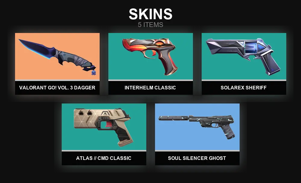 AP 5 skins | VALORANT GO! Vol. 3 Dagger | Solarex Sheriff | ATLAS // CMD Classic | Interhelm Classic | Soul Silencer Ghost | V0392