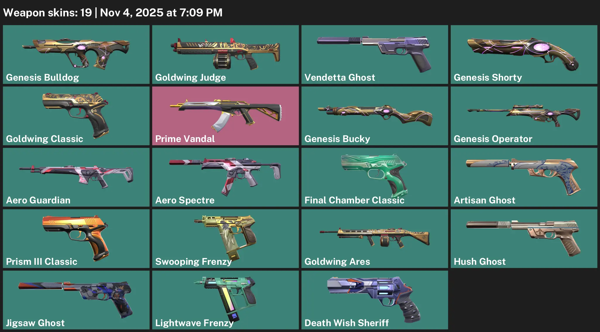 😪 AP 🌷 Unranked 🐽 19 Skins 🧋 100 VP 🛌 15 Agents 🕊 Value: 1775 VP 📨 Genesis Bulldog 🦃 Goldwing Judge 👺 Vendetta Ghost 🪻 Genesis Shorty 😕 Goldwing Classic 🪕 Prime Vandal