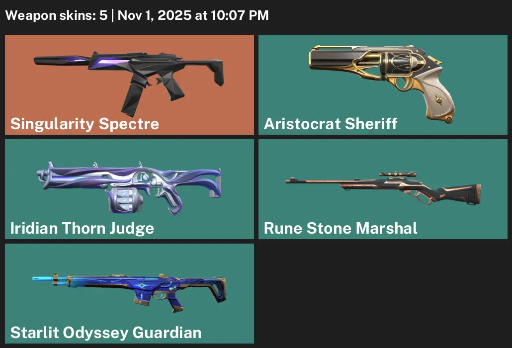 🚰 AP 😶 Unranked 🤹♂️ 5 Skins 🫒 70 VP 🥰 2 Agents 🥮 Value: 3450 VP 🚎 Singularity Spectre 🚟 Aristocrat Sheriff 🥋 Iridian Thorn Judge 🪒 Rune Stone Marshal 💪 Starlit Odyssey Guardian