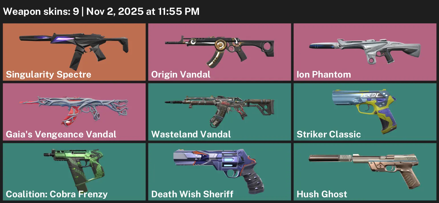 📇 BR 🎎 Unranked 🤣 9 Skins 🚖 0 VP 🪤 17 Agents 🪫 Value: 8775 VP 🥠 Singularity Spectre 📸 Origin Vandal 📔 Ion Phantom 🍁 Gaia's Vengeance Vandal 🤬 Wasteland Vandal 🩲 Striker Classic
