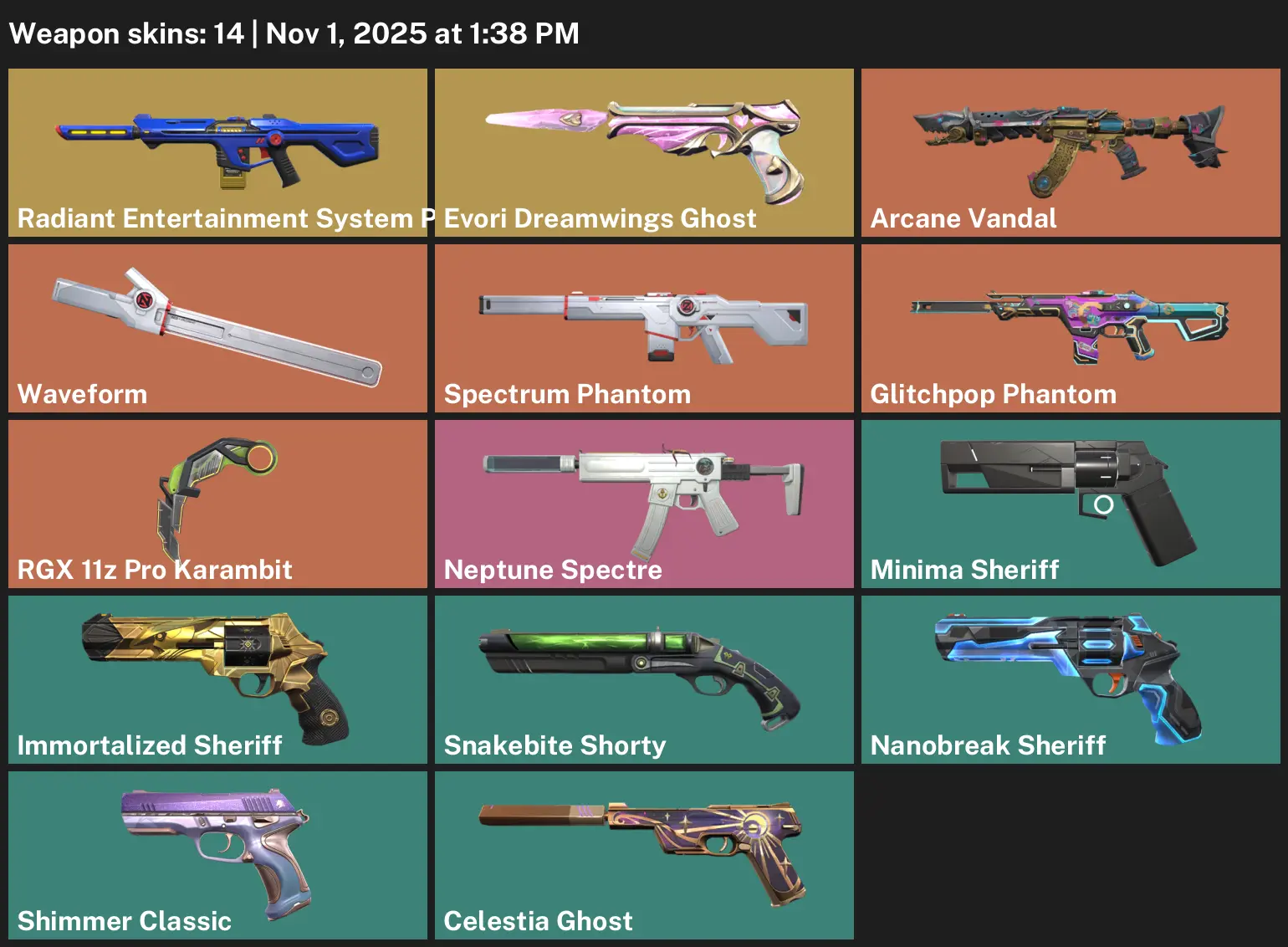 EU | 14 Skins | exp BRONZE 1 | Radiant Entertainment System Phantom | Spectrum Phantom | Glitchpop Phantom | Evori Dreamwings Ghost | S4G