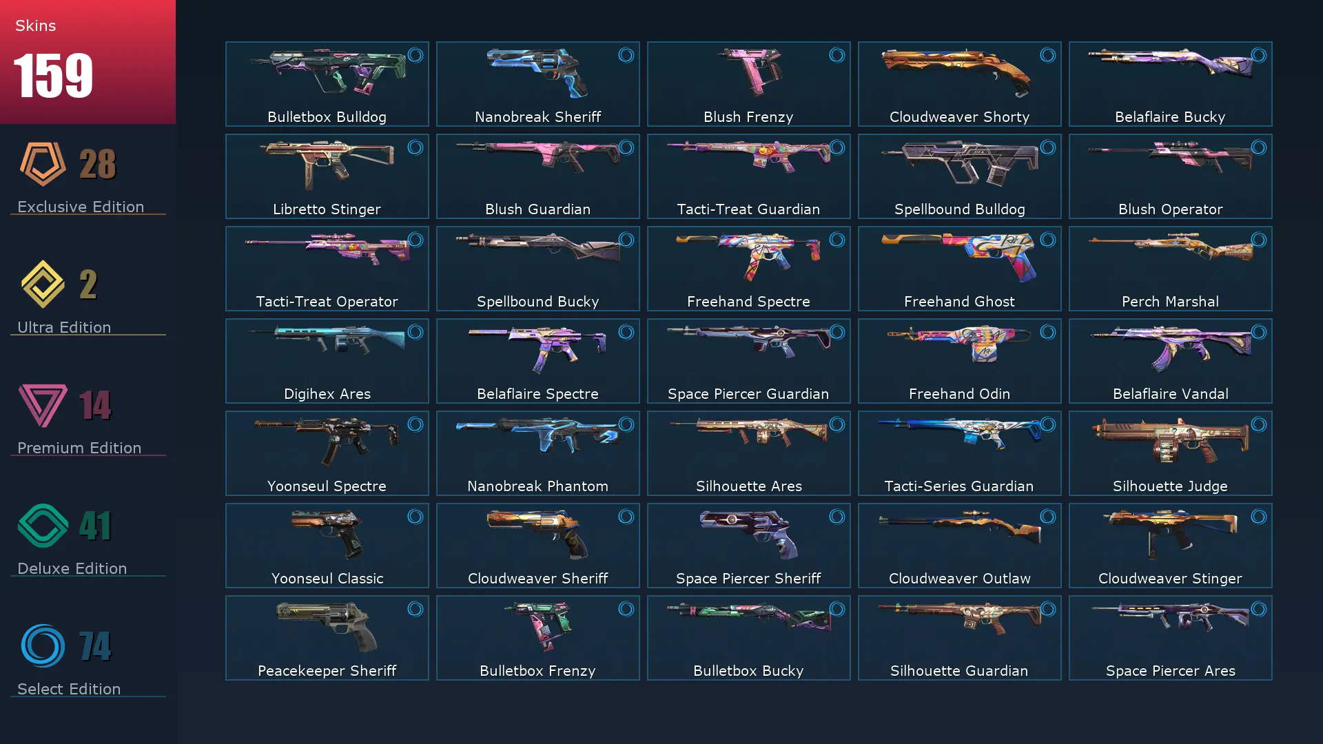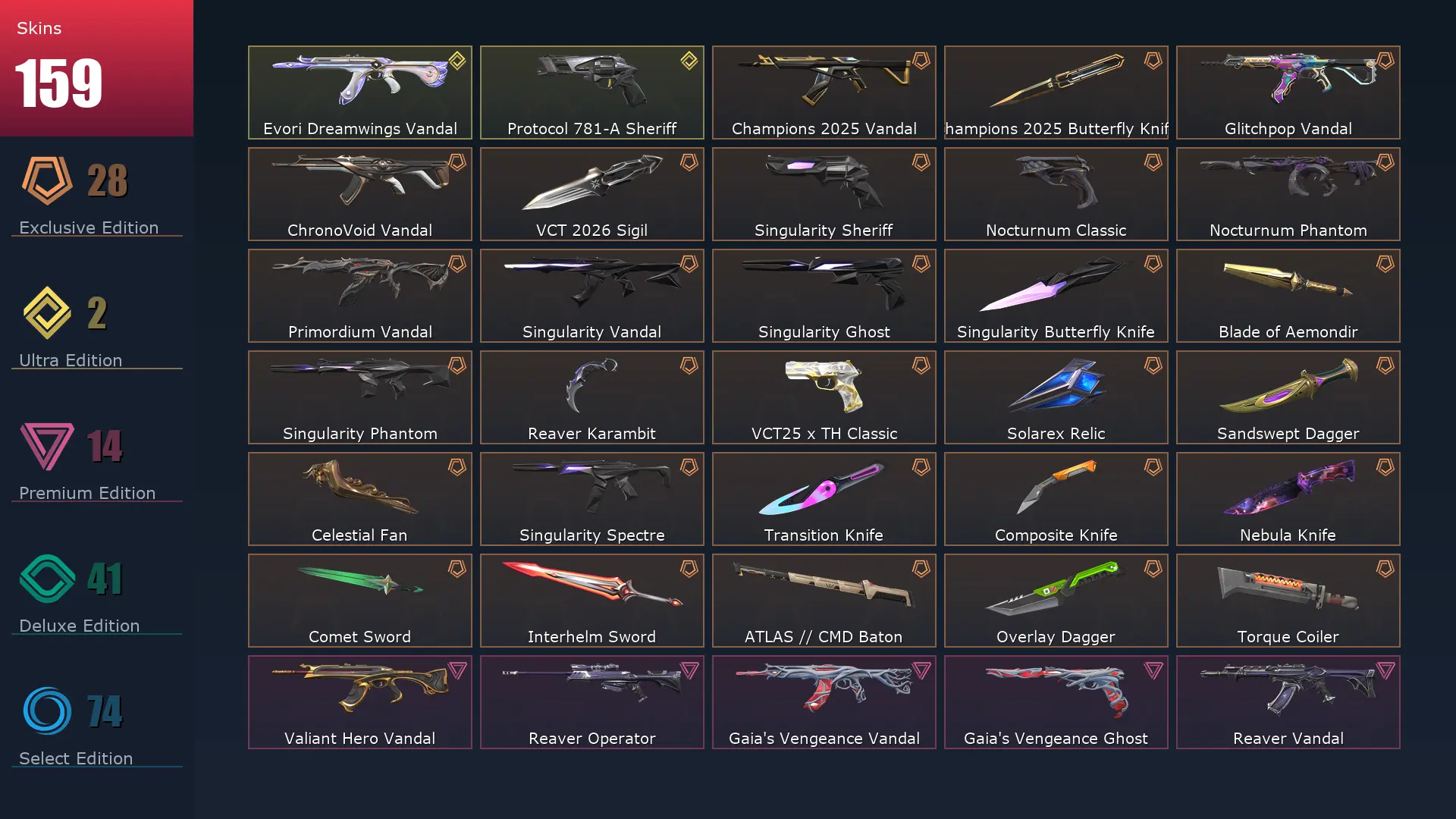 EU 🚛 159 Skins 👈 Ascendant 1 🫓 29 Agents 🍳 271 Level 🧂 Champions 2025 Vandal 📤 Champions 2025 Butterfly Knife 🪵 Sovereign Stinger 🍁 Celestial Fan 🌿 Singularity Vandal 🤯 Singularity Phantom 🐻❄️ Singularity Butterfly Knife