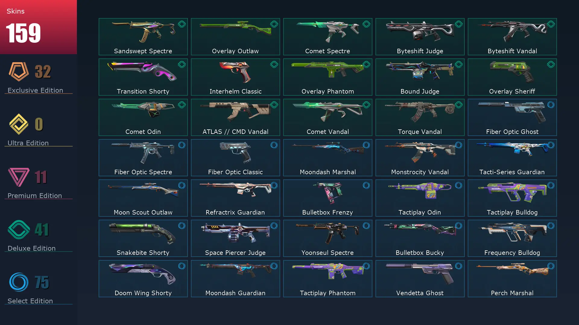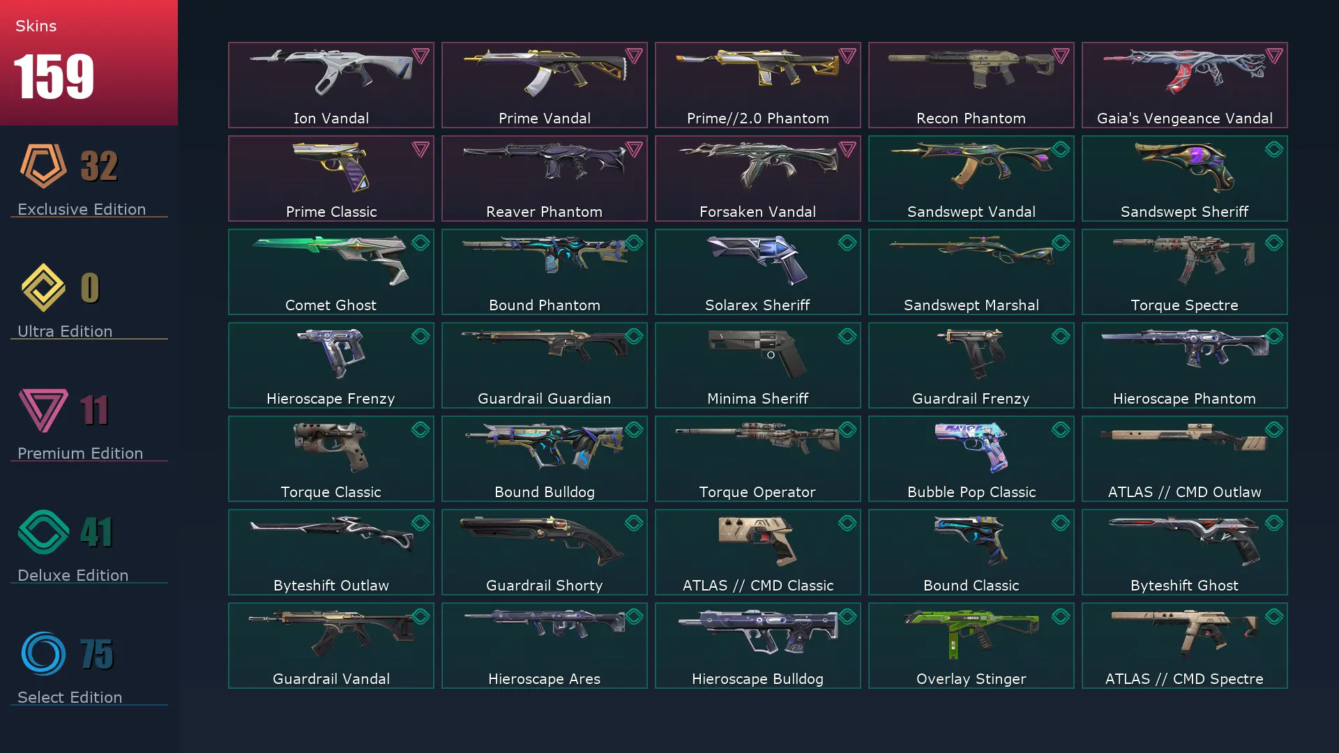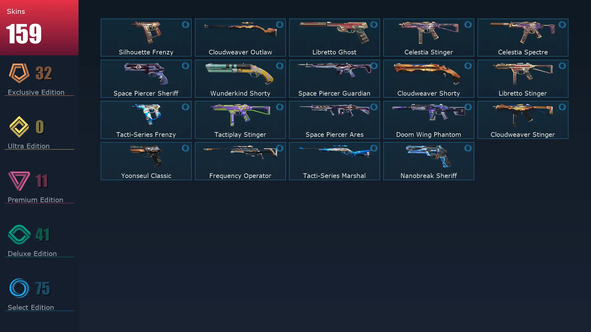 EU 📜 159 Skins 🐮 Platinum 3 🦮 18 Agents 🥊 489 Level 🎷 Arcane Vandal 🌁 Valiant Hero Vandal 🐾 Singularity Butterfly Knife 🧅 Mystbloom Sheriff 🎥 Celestial Fan 🕰 Prime//2.0 Phantom 😥 Mystbloom Kunai 🥝 Reaver Phantom 🐋 Forsaken Vandal