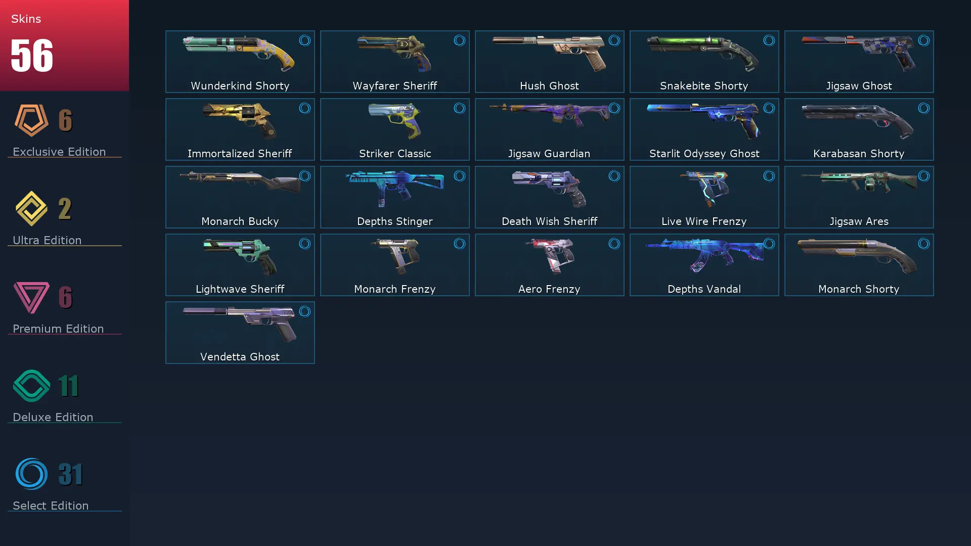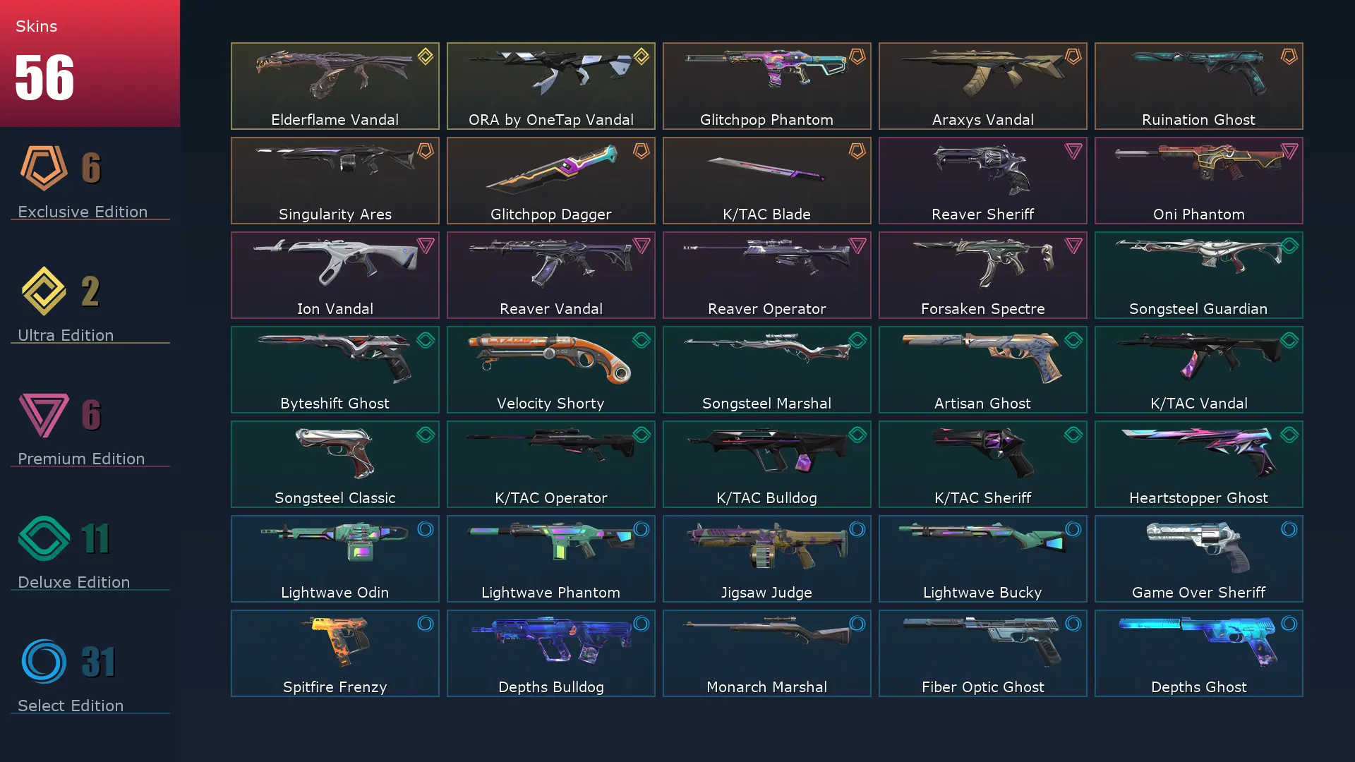 EU 🏗 56 Skins 🐻 29 Agents 🫑 283 Level 📞 Oni Phantom 🥦 ORA by OneTap Vandal 🦨 Reaver Vandal 🛝 Lightwave Odin 🚙 Lightwave Phantom 🐌 Glitchpop Phantom 🥜 Ruination Ghost 🚇 Reaver Sheriff 🕊 Araxys Vandal 🛎 Singularity Ares 🫑 Reaver Operator