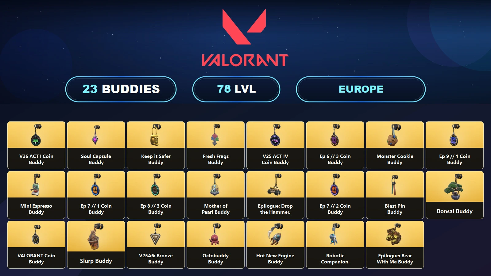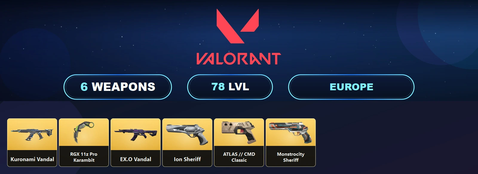 EU ๐ฅช 6 Skins ๐ 78 Level ๐ช Kuronami Vandal ๐ RGX 11z Pro Karambit ๐ Ion Sheriff ๐ช EX.O Vandal ๐ข ATLAS // CMD Classic ๐ค Monstrocity Sheriff ๐ง Unranked ๐ 18 Agents