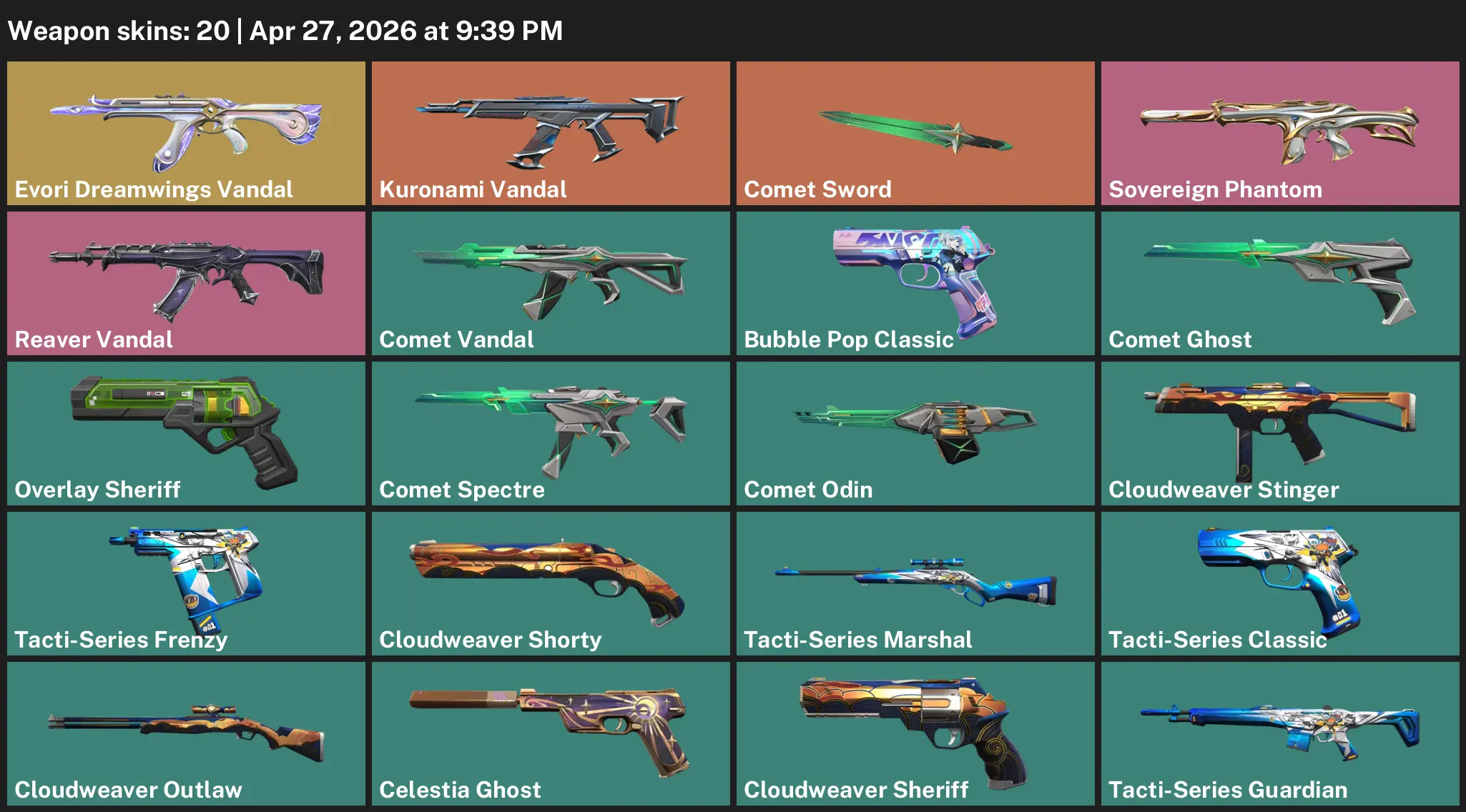 🌍EU | 20 Skins🎭 + 1 Knife🗡 | Kuronami Vandal🌊 | Reaver Vandal🔥 | Sovereign Phantom👑 | Evori Dreamwings Vandal✨ | Comet Sword☄️ | ~8.4K VP Spent💸 | Ranked Ready⚔️