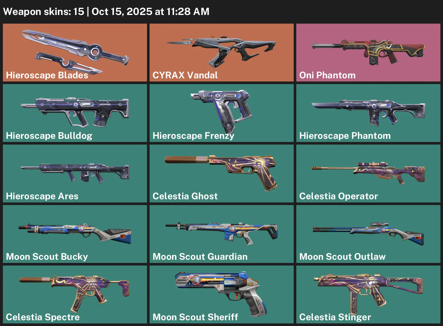 🌜 EU 😃 Unranked 🎐 15 Skins 📿 150 VP 🌋 7 Agents 🫕 Value: 1775 VP 🕳 Hieroscape Blades 🤳 CYRAX Vandal 🎰 Oni Phantom 🏉 Hieroscape Bulldog 🙁 Hieroscape Frenzy 🐪 Hieroscape Phantom