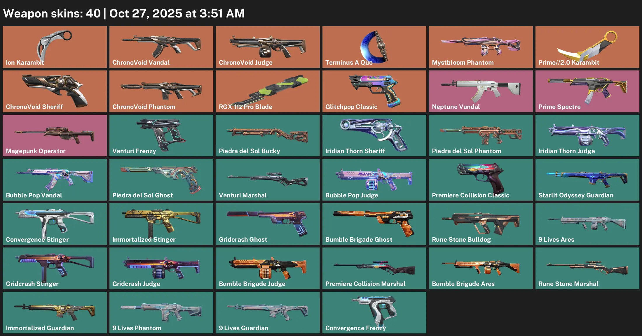 🚉 EU 🐮 Unranked 🐻❄️ 40 Skins 🍴 208 VP 🪗 6 Agents 🛸 Value: 34975 VP 🐚 Ion Karambit 🎊 ChronoVoid Vandal ⛈ ChronoVoid Judge ⛰ Terminus A Quo 🐃 Mystbloom Phantom 👎 Prime//2.0 Karambit
