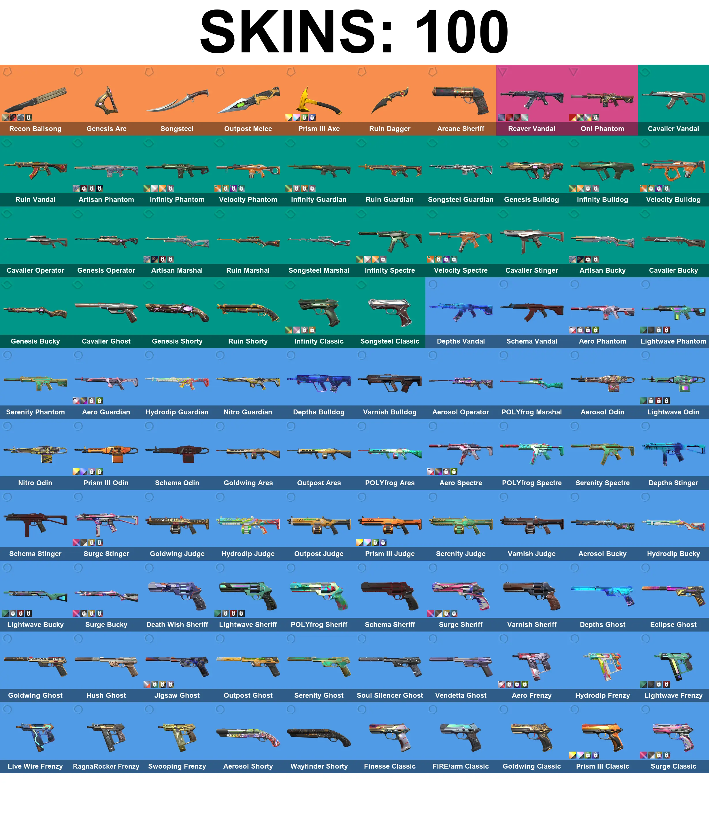 LATAM | 100 Skins + 6 Knives | Ruin Dagger | Arcane Sheriff | Reaver Vandal | Oni Phantom | Recon Balisong | Genesis Arc | Songsteel | Outpost Melee | Prism III Axe | Cavalier Vandal | Ruin Vandal | Artisan Phantom | 2x Bronze Buddy + 8x Silver Buddy