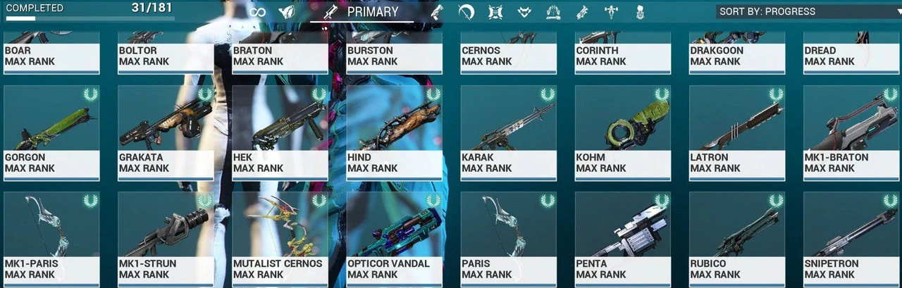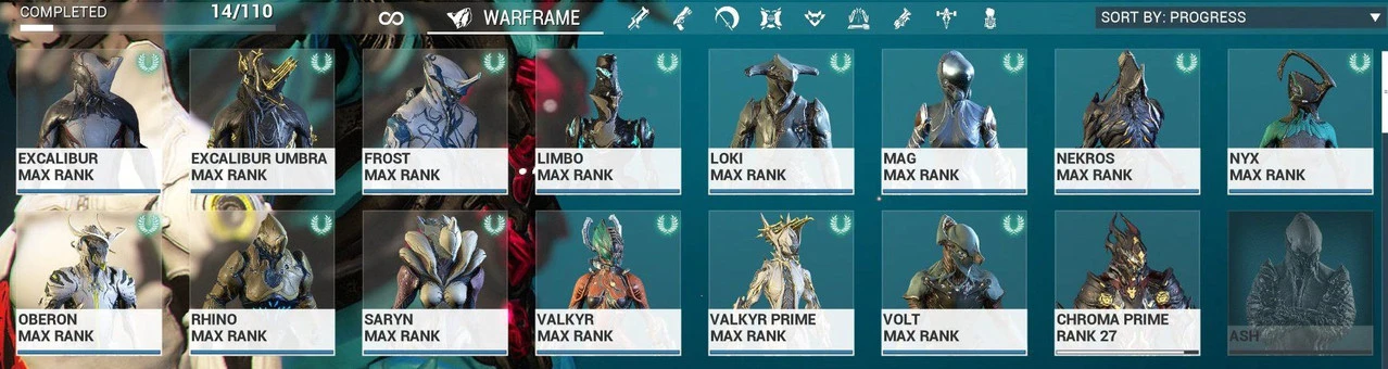 Warframe ⸱ Mastery Rank 13 ⸱ 14 Warframes ⸱ 31 Weapons ⸱ Legendary Rank 6