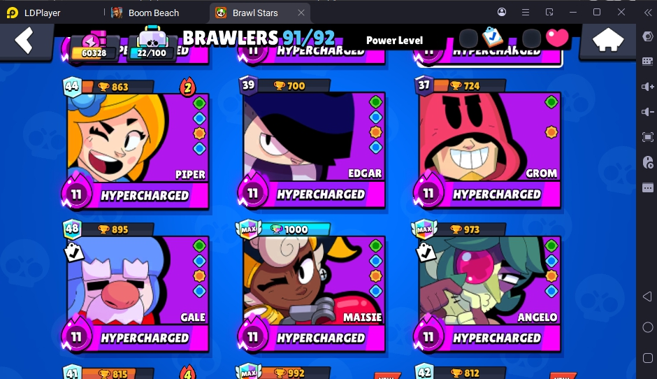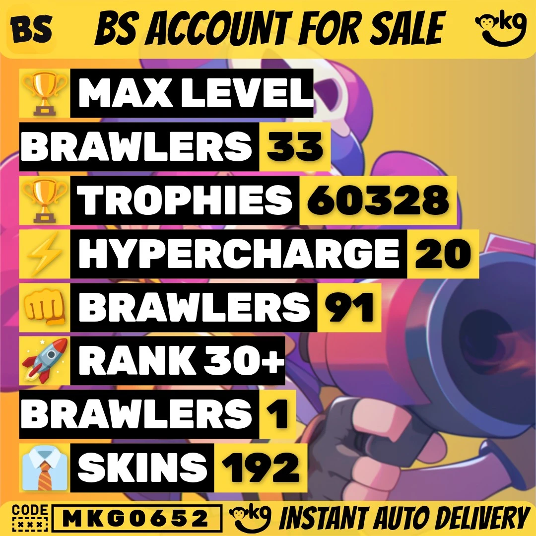 192 SKINS 💯 PIN 11.11 🧡 60.328 TROPHIES 🏆 91 BRAWLERS 🐼 20 HYPERCHARGED 🩸 33 MAX BRAWLERS 💛 CURSED KENJI 🧡 !MKG0652