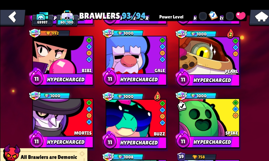 213 SKINS â 70.000 TROPHY â 93 BRAWLERS â 16 MAX â 13 HYPERCHARGED â MECHA MORTIS â BELLE GOLDHAND â NINJA ASH â KONG SURGE â FANGUARD â SPIKE â LEGENDARY â LEON