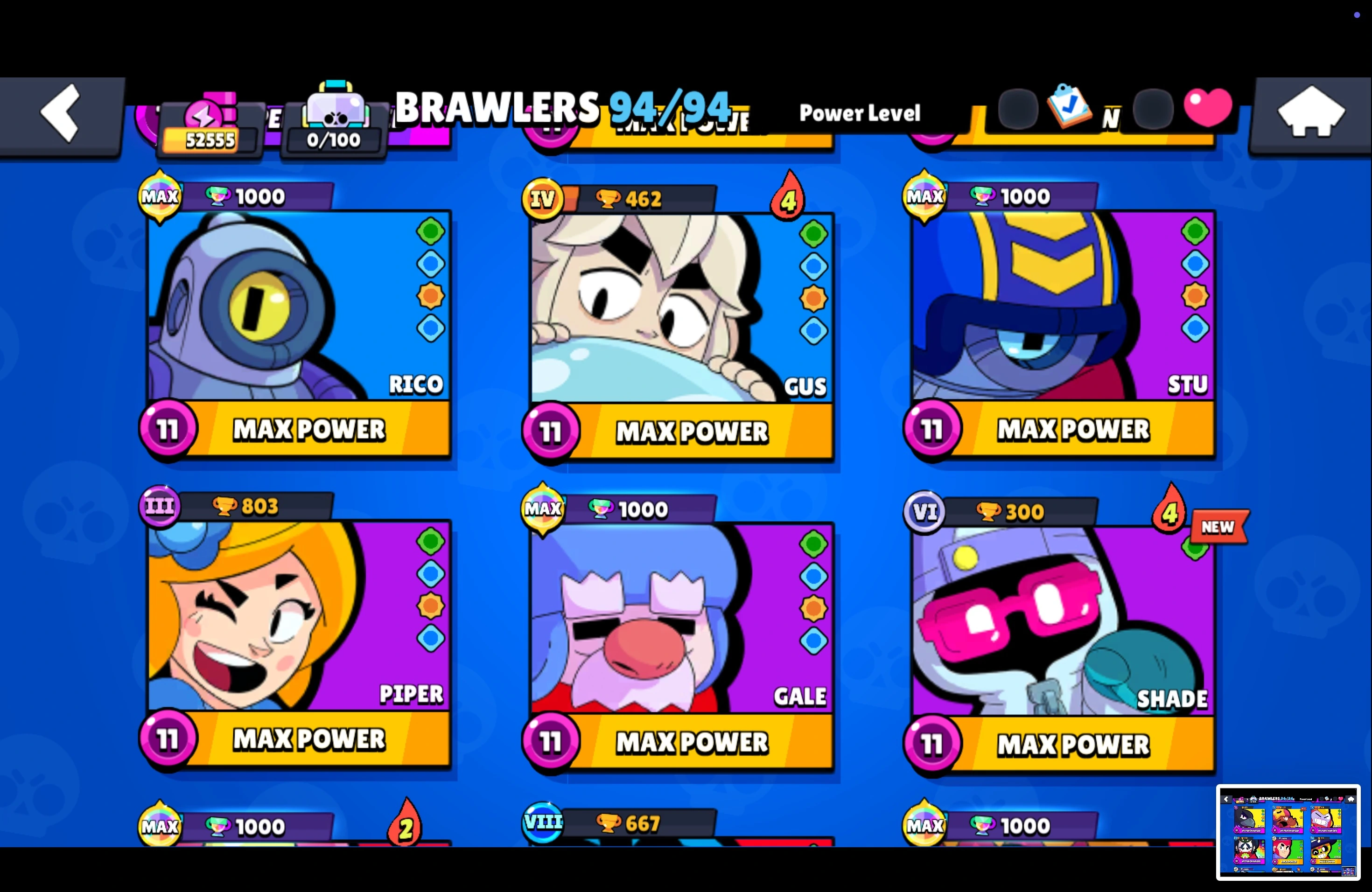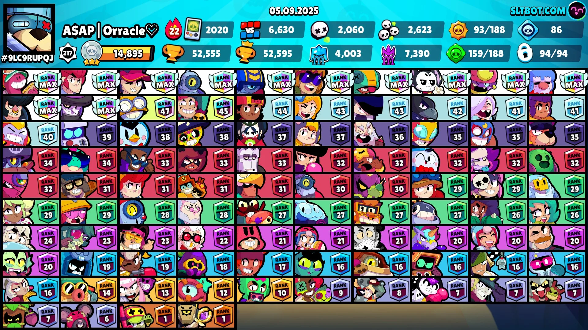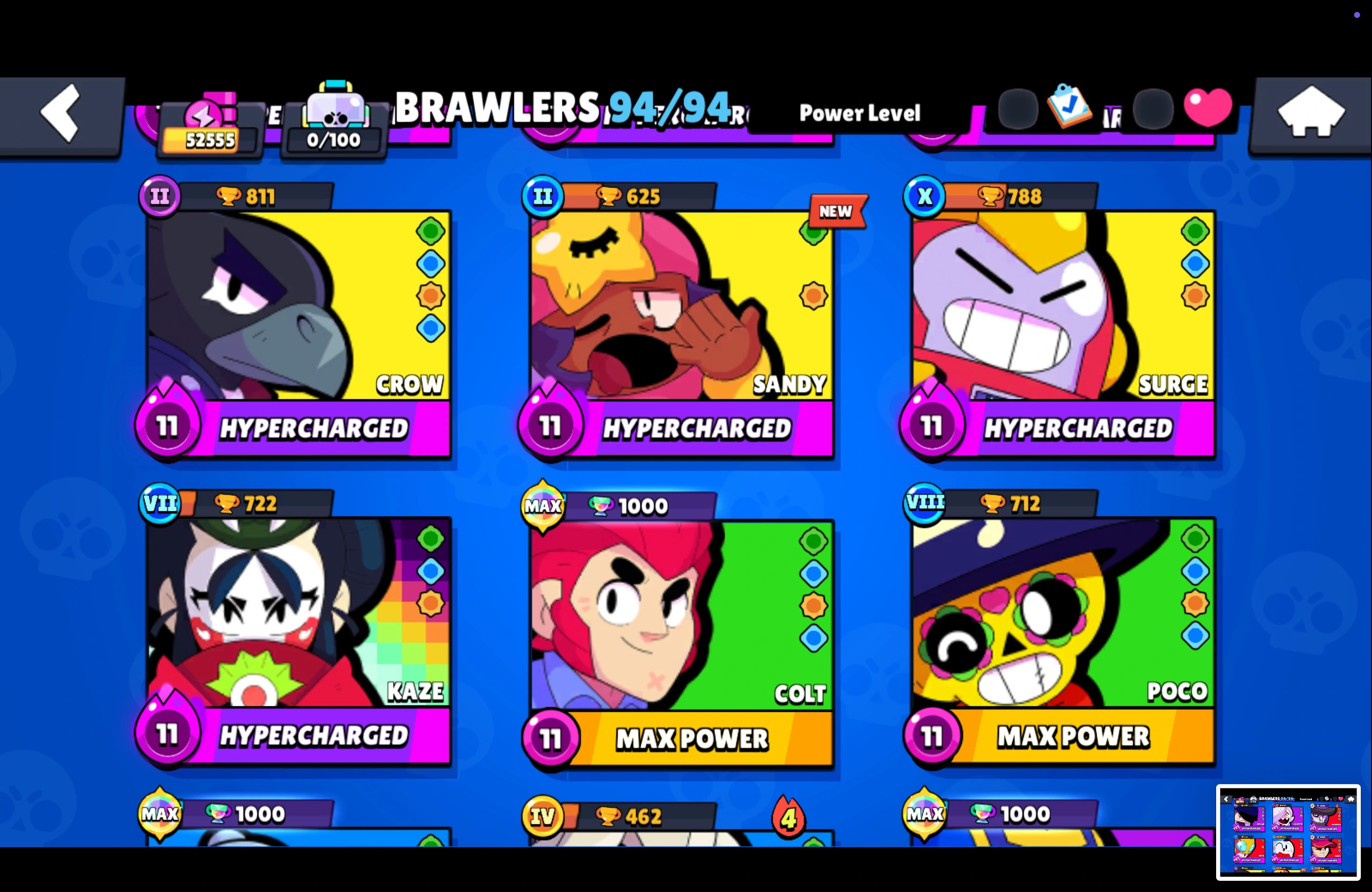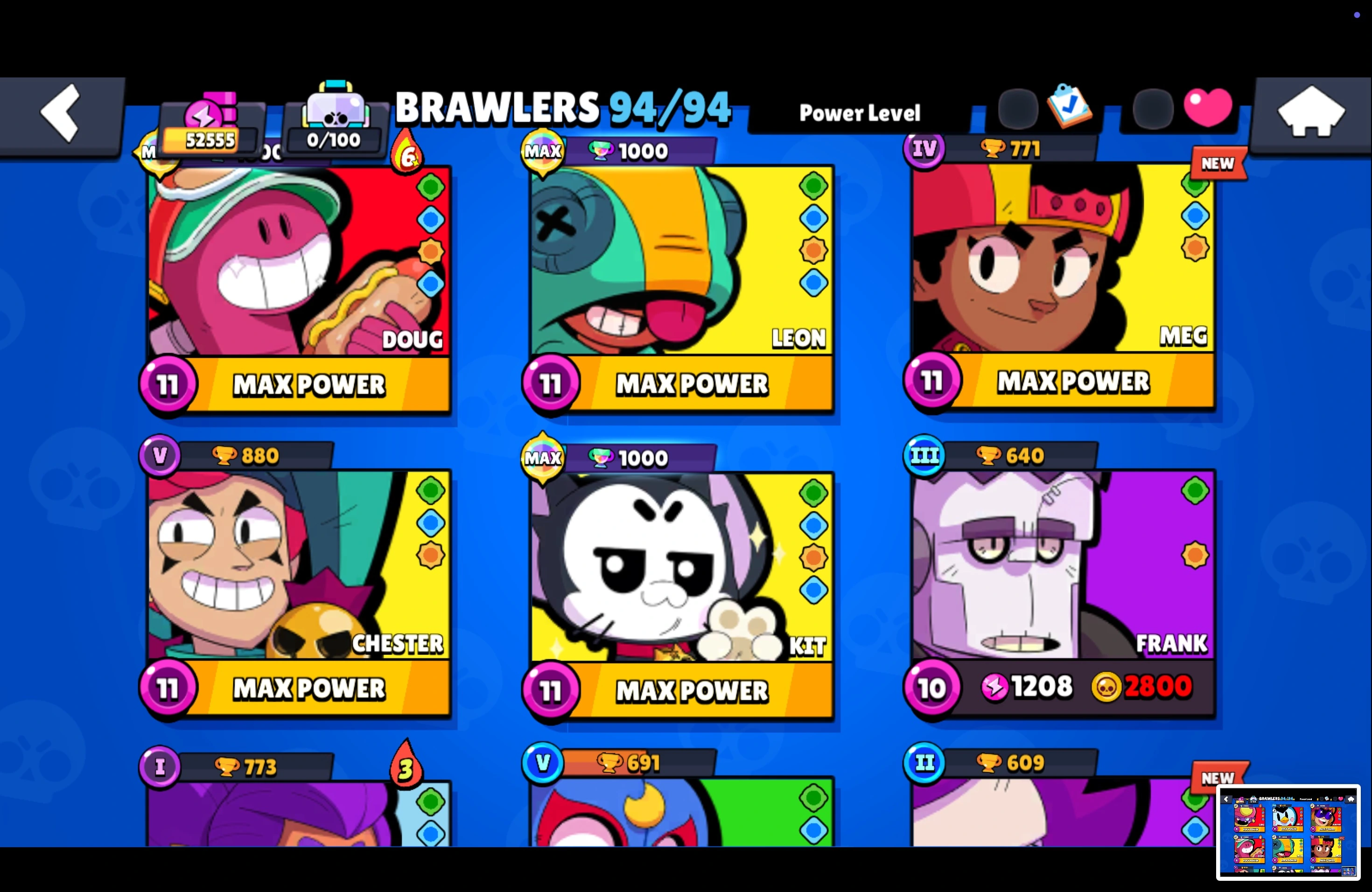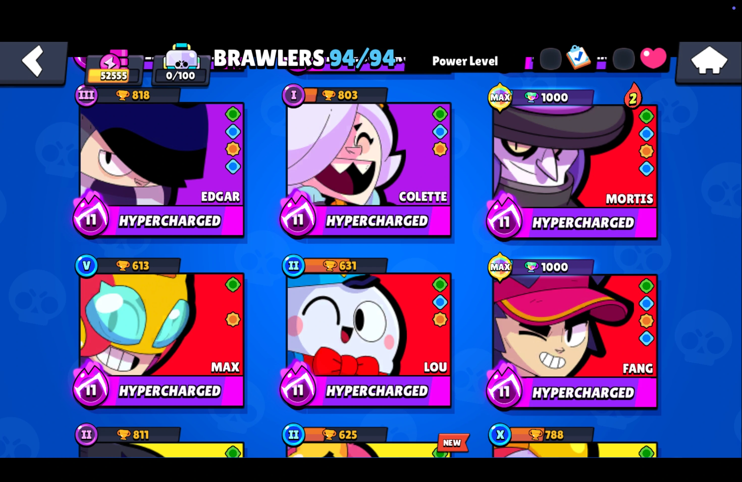 228 SKINS â 52.600 TROPHY â 94 BRAWLERS â 32 MAX â 16 HYPERCHARGED â RONIN RUFFS â CESAR SAM â CORSAIR COLT â MECHA PALADIN SURGE â FANGUARD FANG â POOP SPIKE â LEGENDARY â LEON