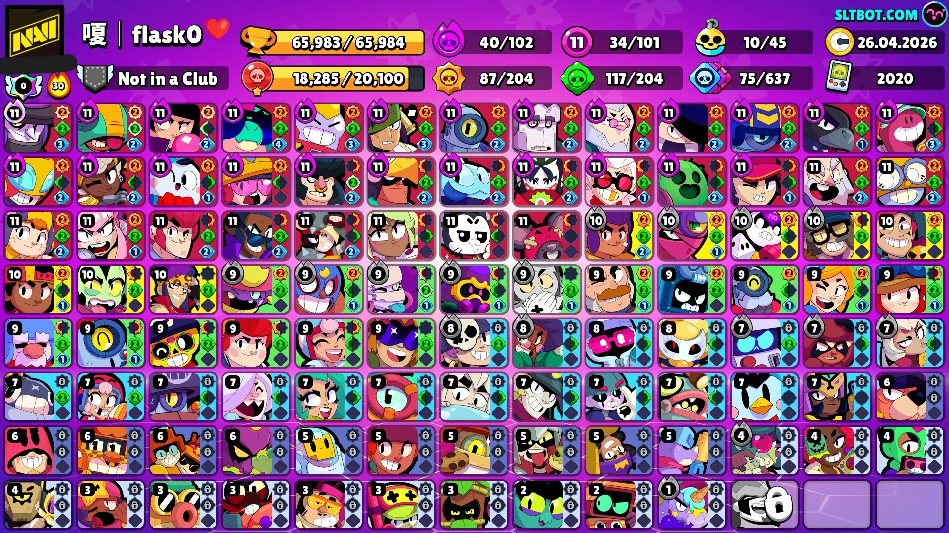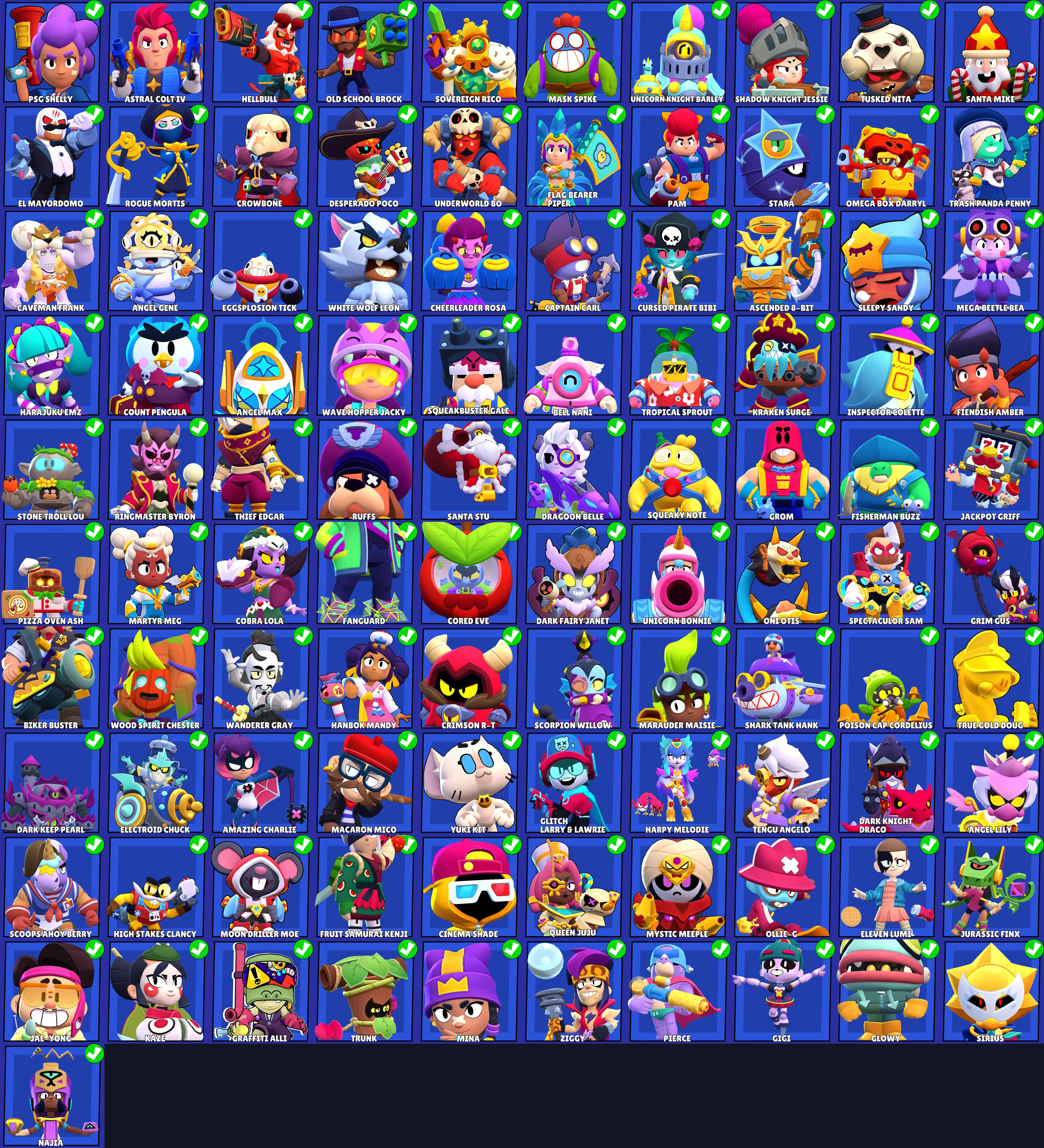 252 SKINS 💯 65.983 TROPHIES 🏆 101 BRAWLERS 🐼 24 HYPERCHARGED 🩸 46 PRESTIGE 💜 32 MAX BRAWLERS 💛 10 BUFFIES 🔑 WHITE WOLF LEON 🧡 BANANAS COLT 🧡 CAPITAN CARL 🧡 PSG SHELLY 🧡 ELEVEN LUMI 💯 50K 60K