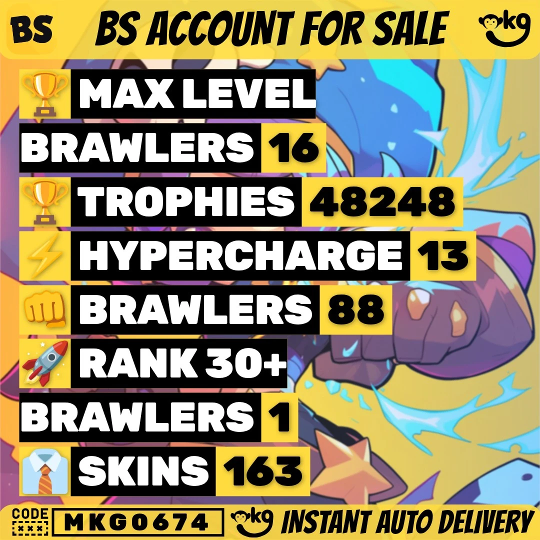 163 SKINS 💯 48.248 TROPHIES 🏆 88 BRAWLERS 🐼 13 HYPERCHARGED 🩸 16 MAX BRAWLERS 💛 BANANAS COLT 🧡 LOKI CHESTER 🧡 !MKG0674