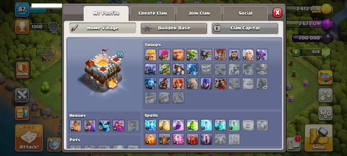 1450✨TH11✨Level 87✨King 34 Queen 38 Minion 20 Warden 14✨Gems 414✨ Point League 434