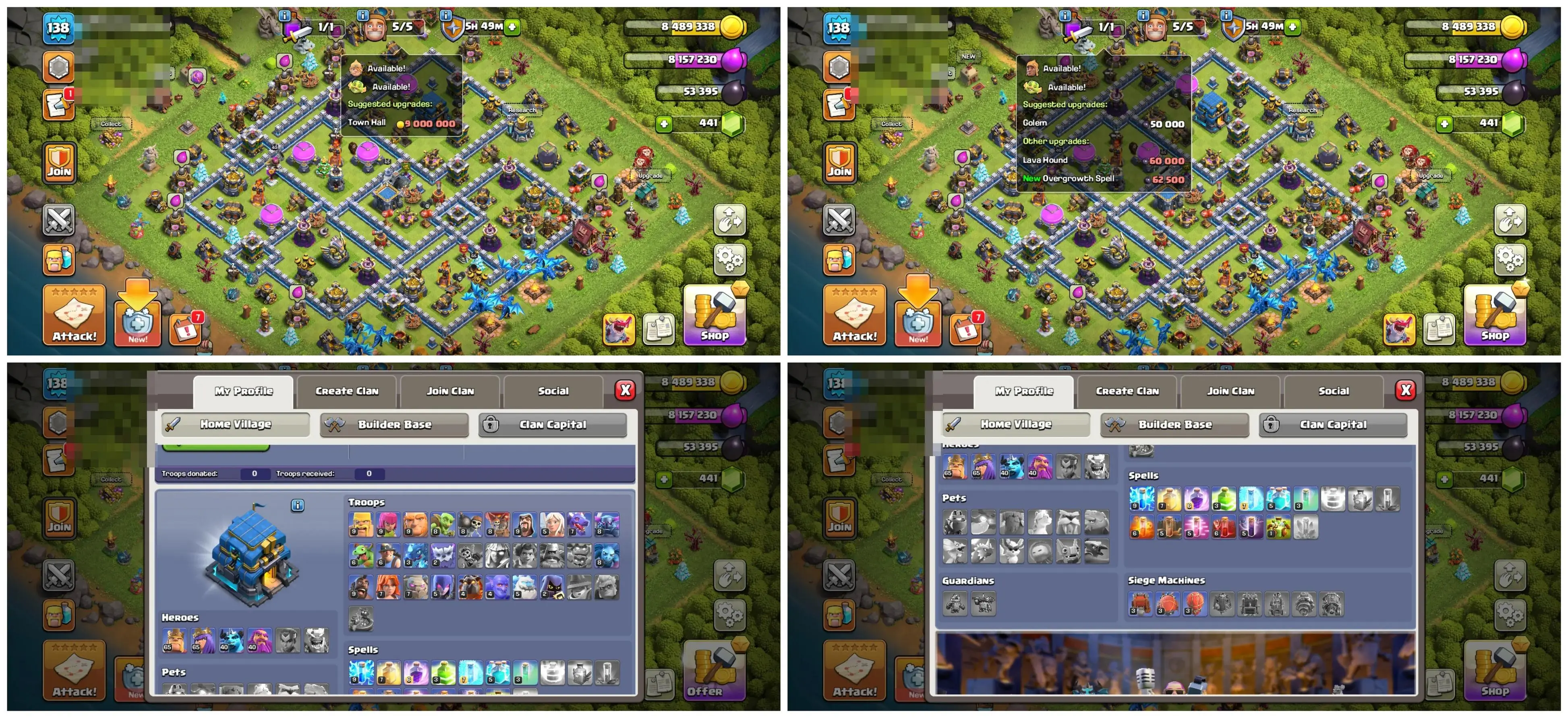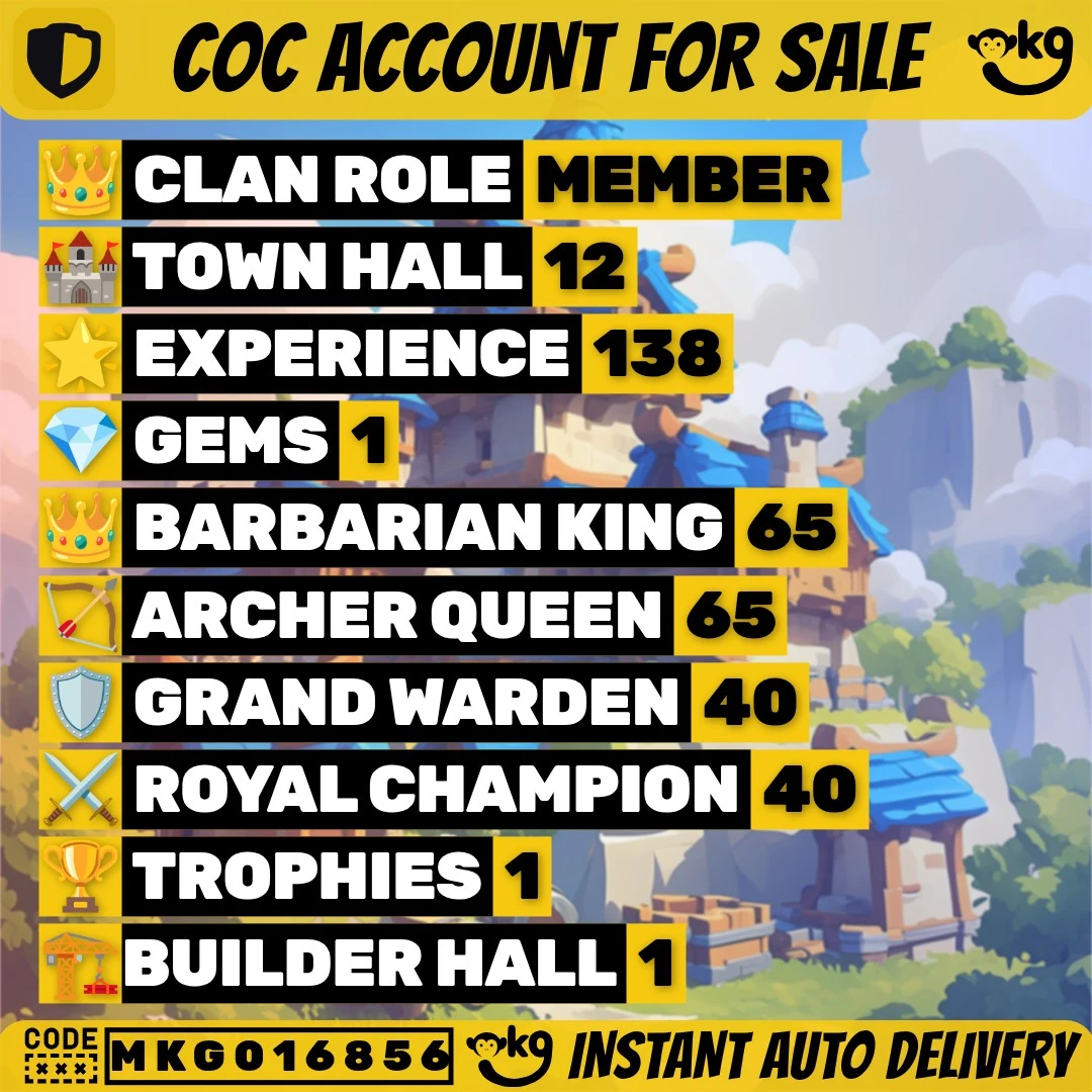 🏰 TH12 ✨ 99% Max | 💎 — | 📈 Lvl 138 | 🦸♂️ Heroes 65/65/40/40 | 👕 4 Skins | ⚔️ 2 Epic Eq. | 💰 Nc 1,000 Gems | 📱 Android/iOS | 🆔 M3772 !MKG016856