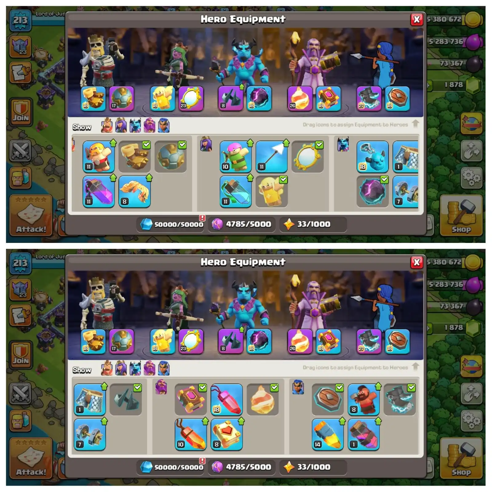 TH 16 ACCOUNT || XP LVL 213 || [ 5 HIGH LVL EPICS ] || 650+ CWL MEDALS || HIGH DEFENCE & TROOPS || SKINS || NC 1000 GEMS || IOS & ANDROID BOTH || INSTANT DELIVERY