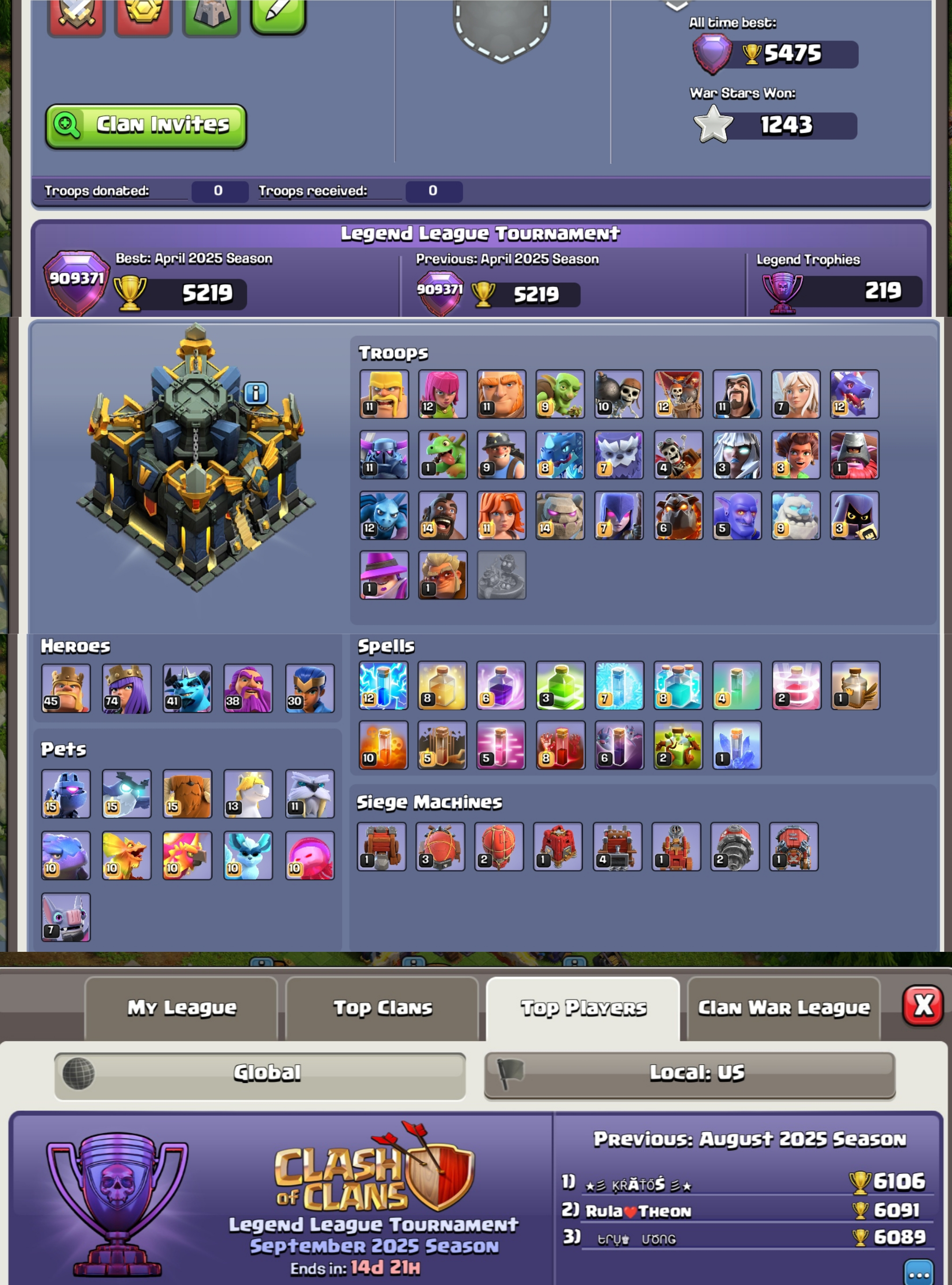 TH 17 ✨ USA LOCAL ✨ 8 PETS MAX & 12 TROOPS MAX ✨ HEROES K-45 AQ-74 MP-41 GW-38 RC-30 ✨ 6 EPIC EQUIPMENT ( 2 EPIC MAX )