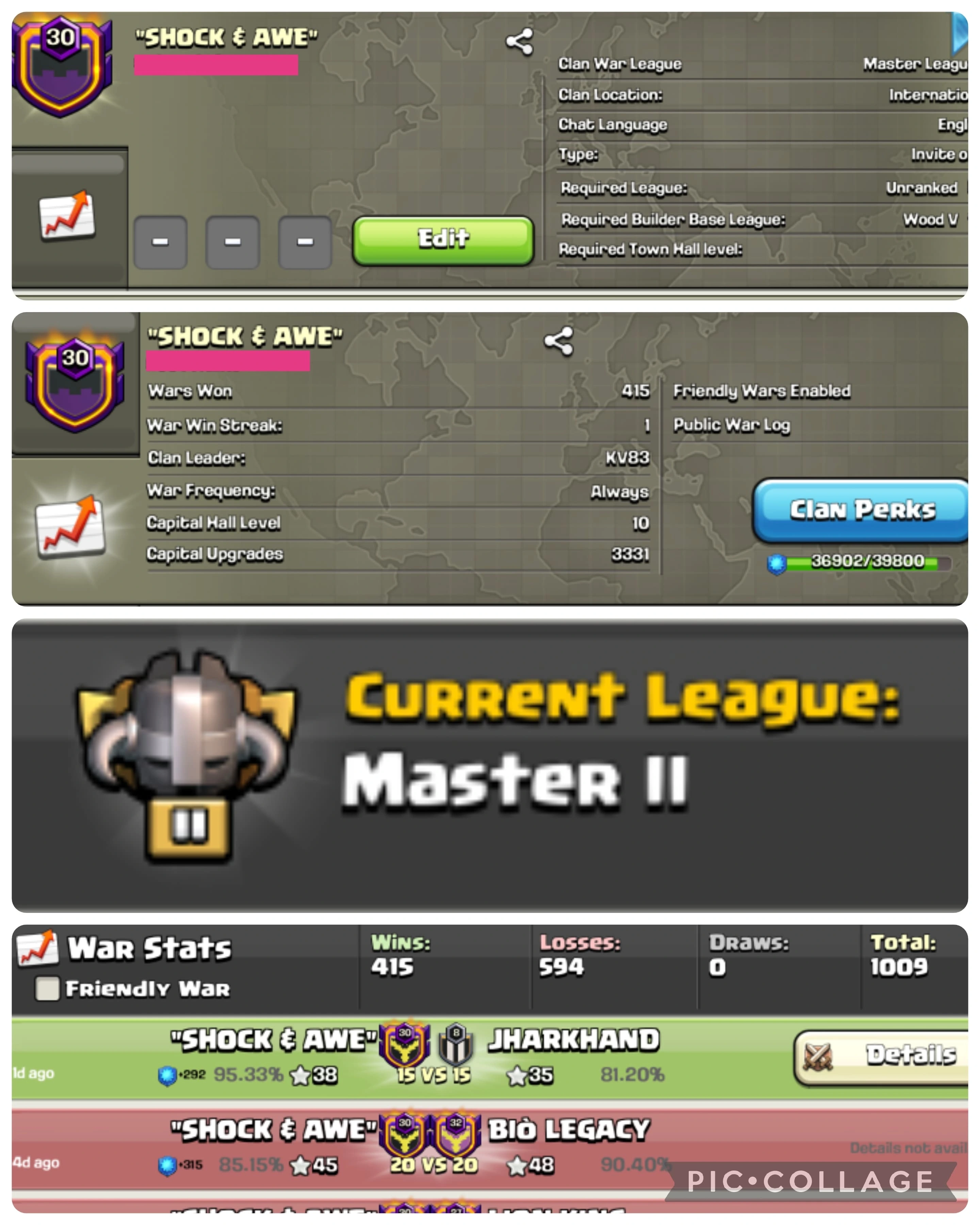 💥LEVEL 30.9 + MASTER 2 + CC 10 😋 NAME : SHOCK & AWE 👌 415 WINS 594 LOSSES 🩵