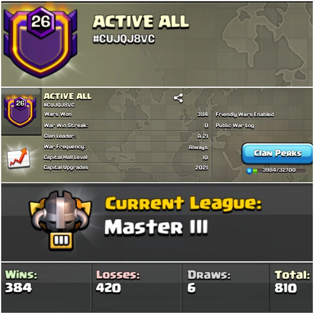 Level 26 | Name - ACTIVE ALL | Clan Capital - 10 | Master League | Fast Delivery