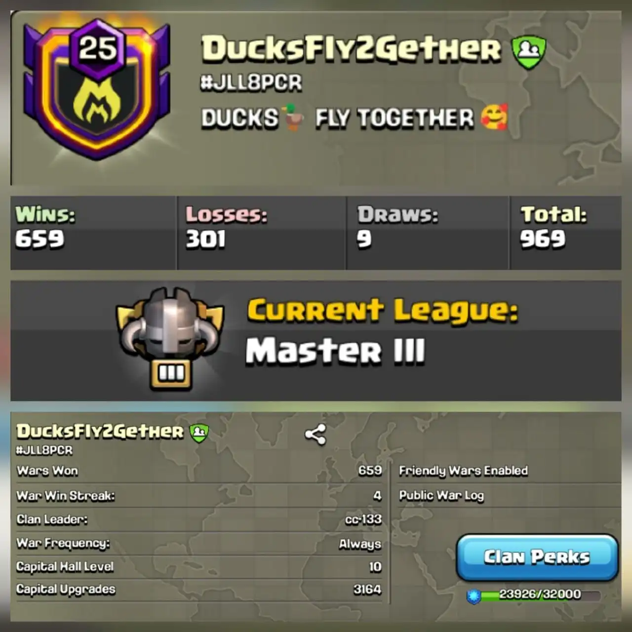 Level 25 clan || clan capital 10 || master 3 || warlog 659-301 || name - DucksFly2Gether