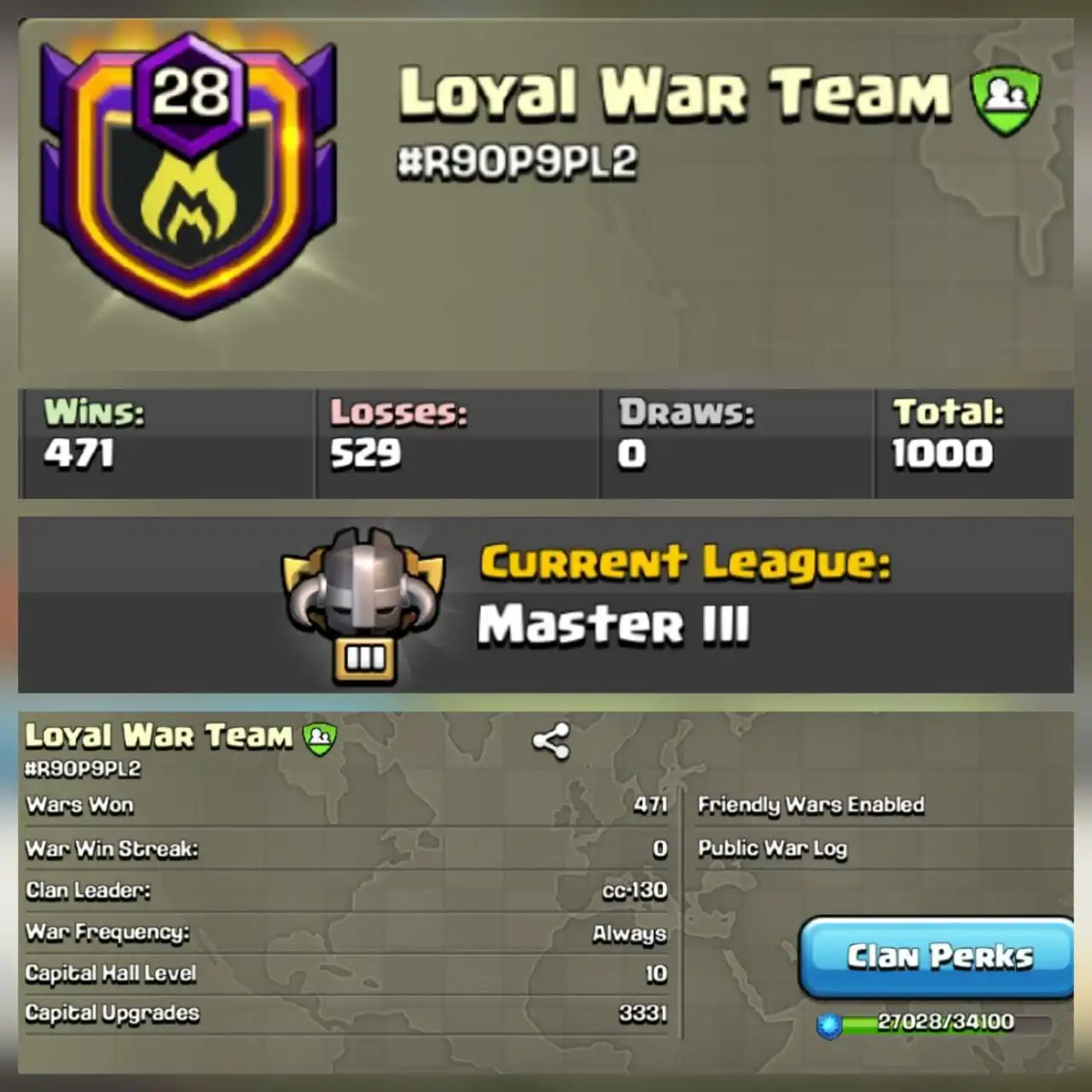 Level 28 clan || clan capital 10 maxed 3331 upgrades || master 3 || name - Loyal War Team