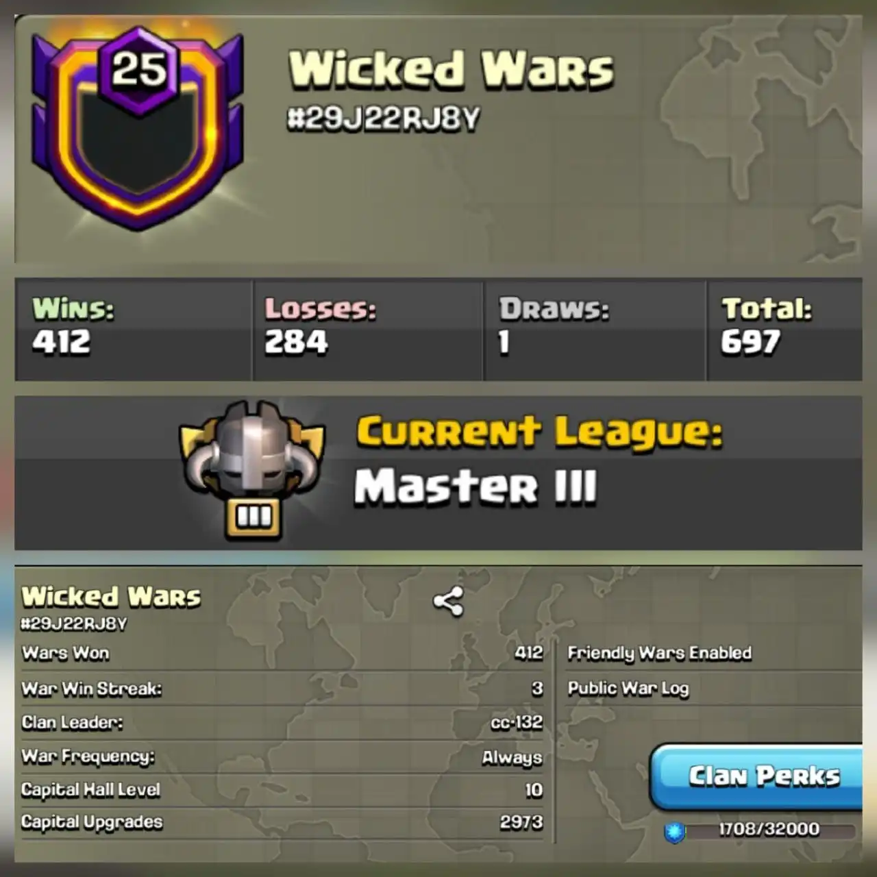 Level 25 clan || clan capital 10 || master 3 || warlog 412-284 || name - Wicked Wars