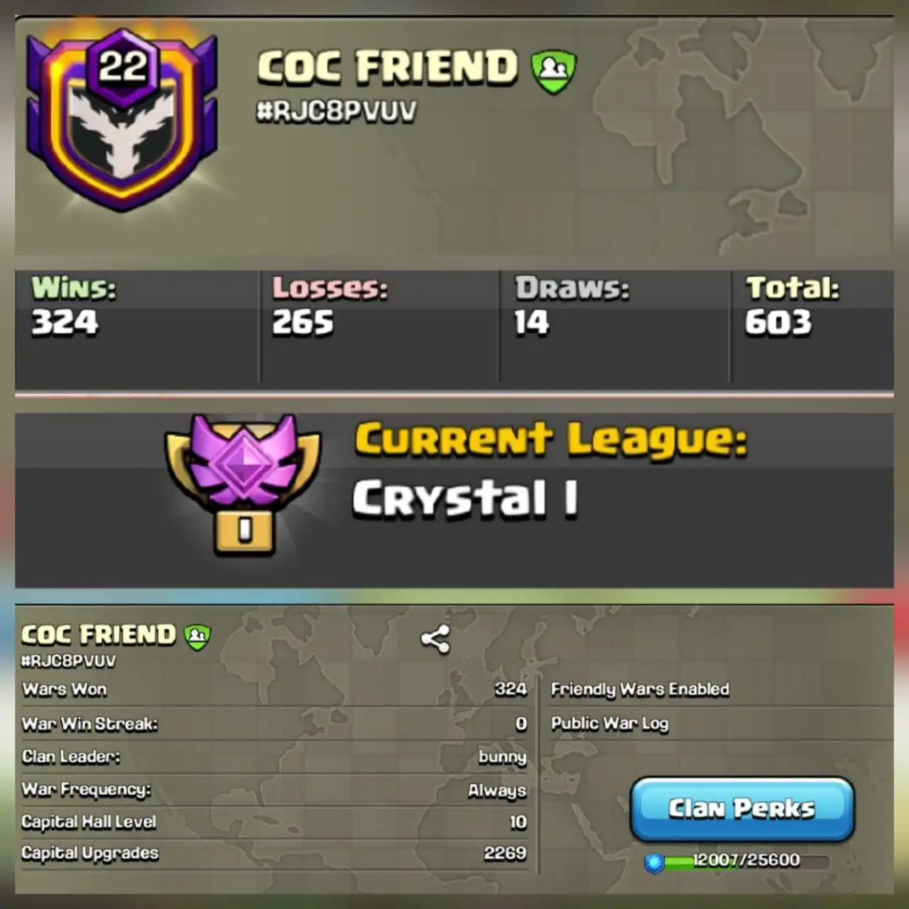 Level 22 clan || clan capital 10 || crystal 1 || war log 324-265 || name - COC FRIEND